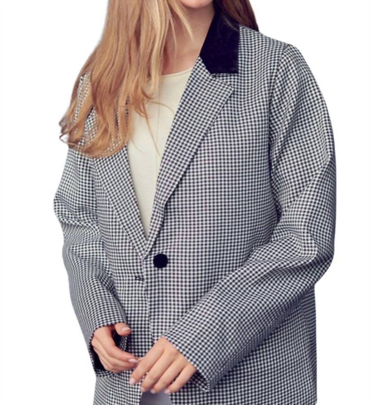 Tailored to perfection, this blazer will be your go-to jacket for years to come. Elevate your wardrobe with the Contrast Lapel Collar Houndstooth Blazer by &merci in sleek black. This women's blazer showcases a timeless houndstooth pattern with long sleeves and a sophisticated notched contrast lapel collar. Featuring a button closure, it comes equipped with practical welt front pockets. Embrace its classic elegance for any occasion.
