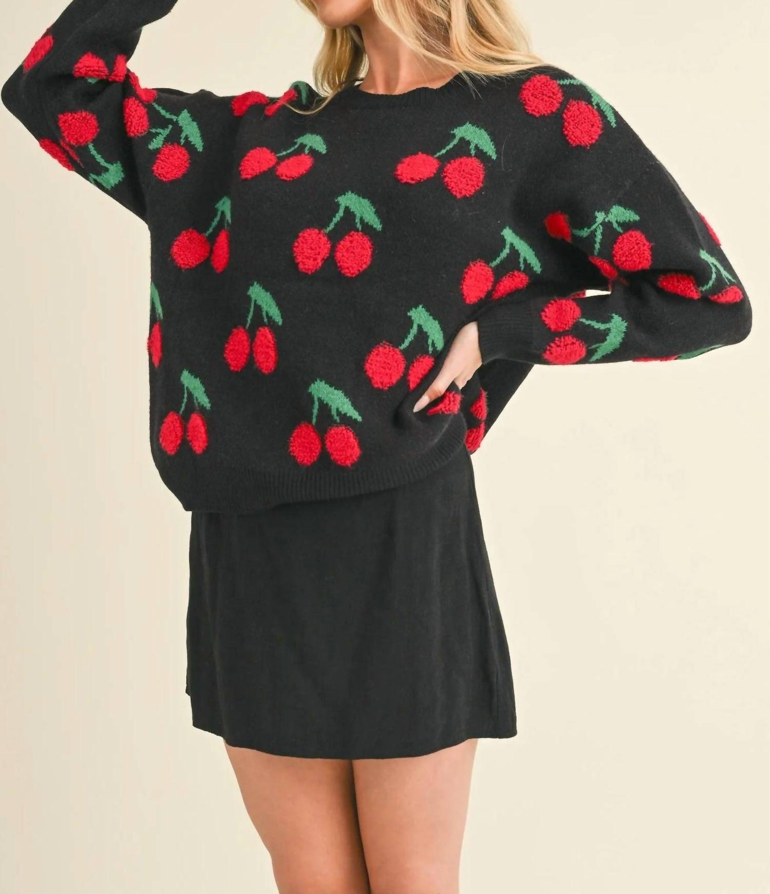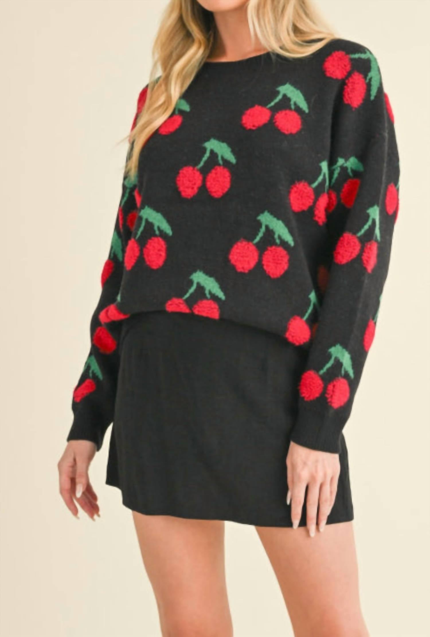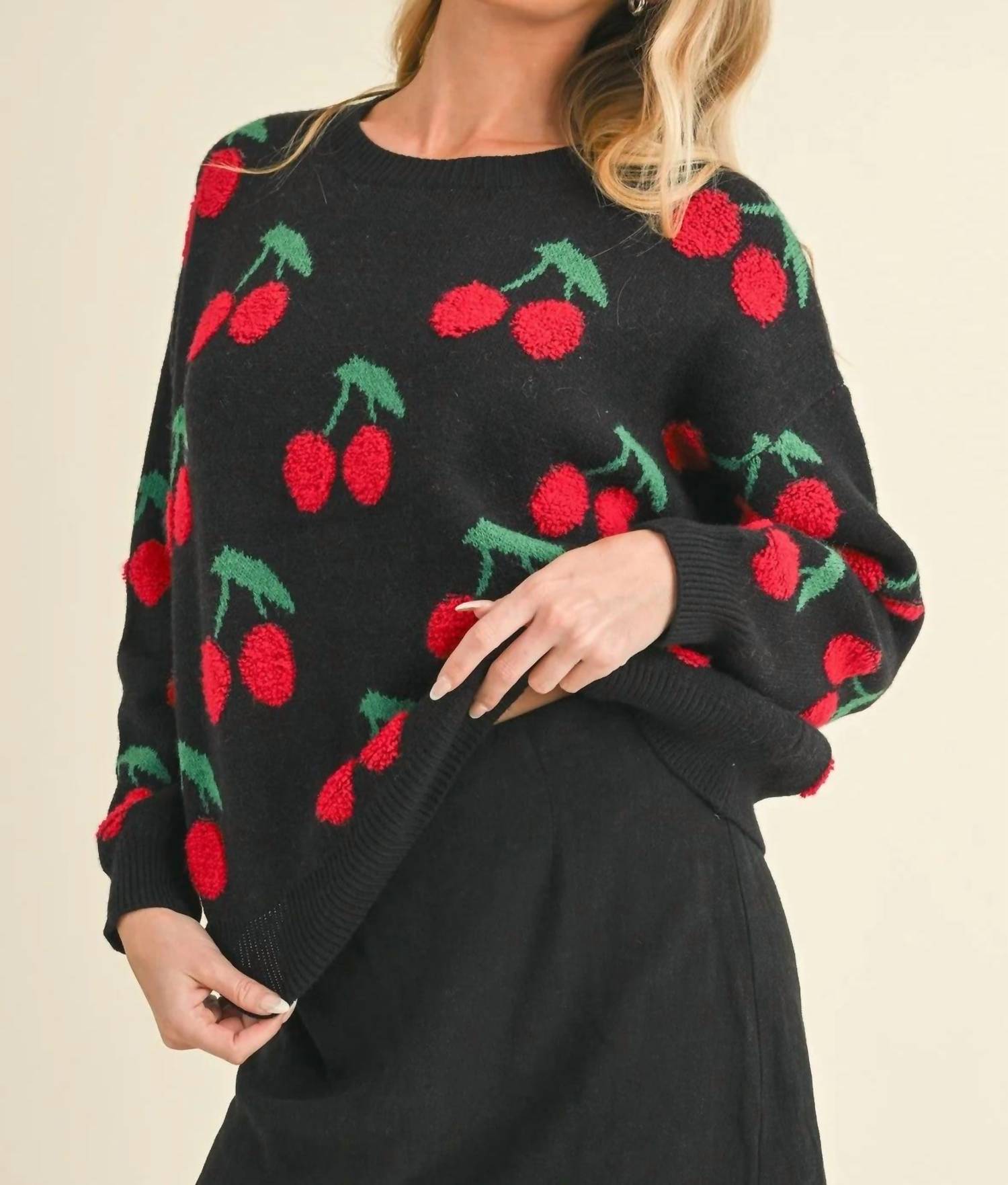 Stay warm and stylish in this versatile and effortlessly cool knitwear staple. Wear it alone or layered, it's the perfect sweater for the season and you'll wish you had it in every color. This knit pullover features long sleeves with drop shoulders and a relaxed fit, enhanced by its whimsical cherry design. Enjoy the ribbed crewneck, cuffs, and hem for a polished look. Pull-on design.