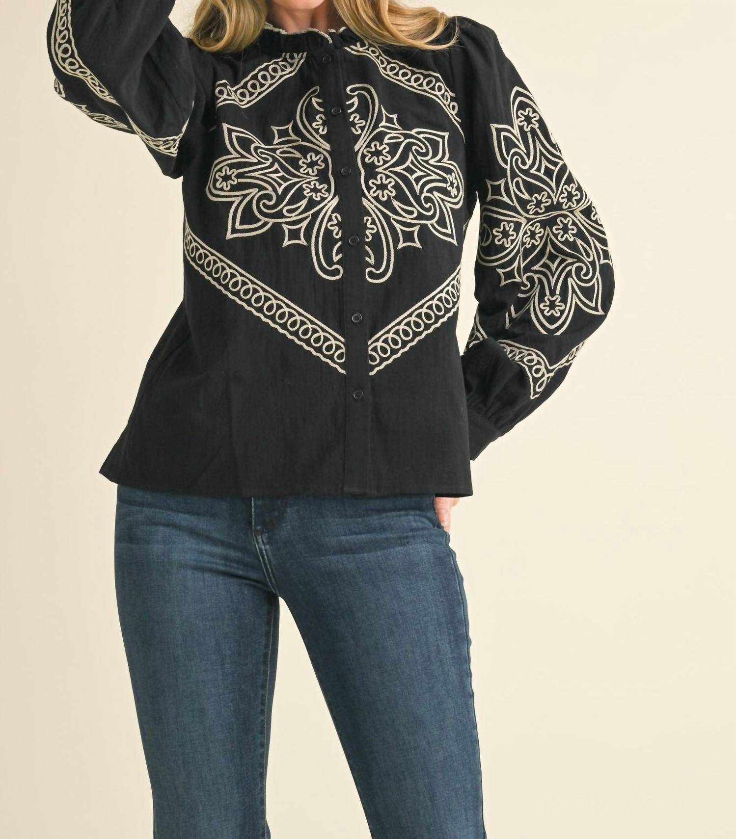 A classic button down shirt that will never go out of style. Crafted to refine your style with elegant detailing. Flaunts long puff sleeves with buttoned cuffs and a charming ruffled mock neckline. Adorned with delicate embroidery on the front and sleeves. Made entirely from 100% cotton. Button-up top ensures a luxurious feel. Experience sophisticated fashion.