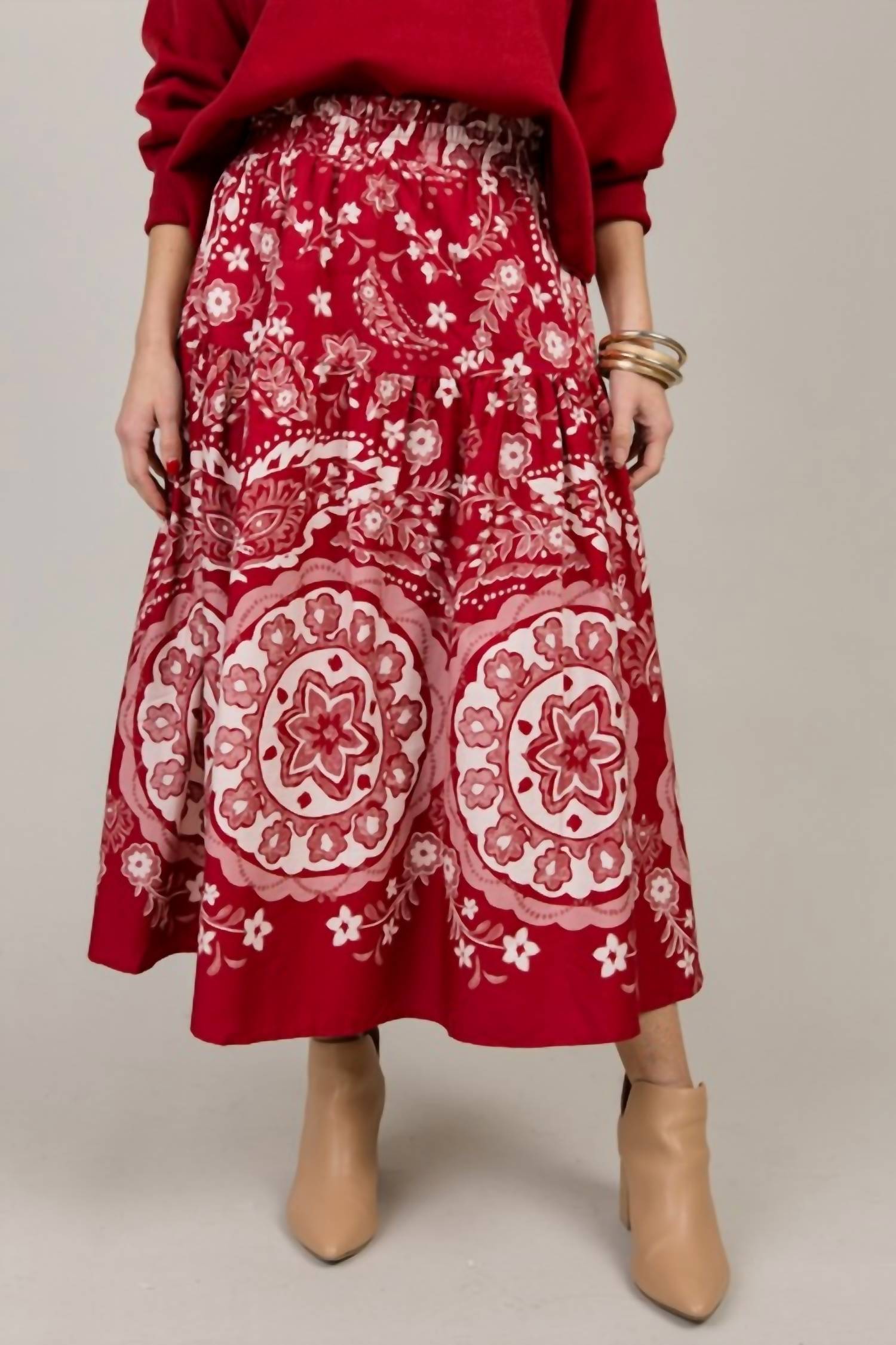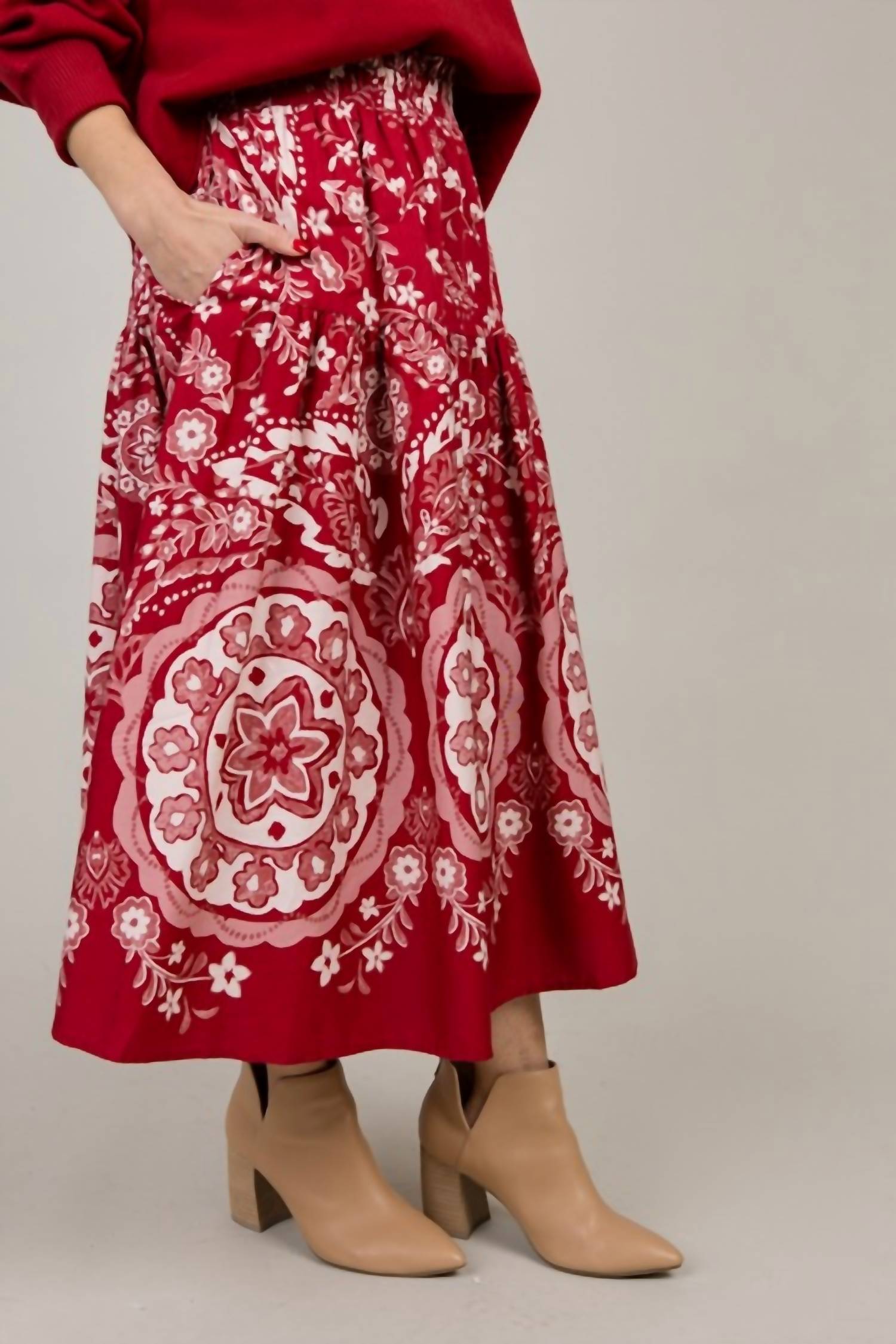 Introducing the Medallion Skirt by &merci, a perfect blend of elegance and bohemian flair in a stunning wine color. Crafted from cotton, this patterned midi skirt showcases bold medallion designs. Its pull-on style and elastic waistband ensure a comfortable and flattering fit. With added pockets, this versatile piece is ideal for a variety of occasions, from casual daytime outings to elegant evening events.