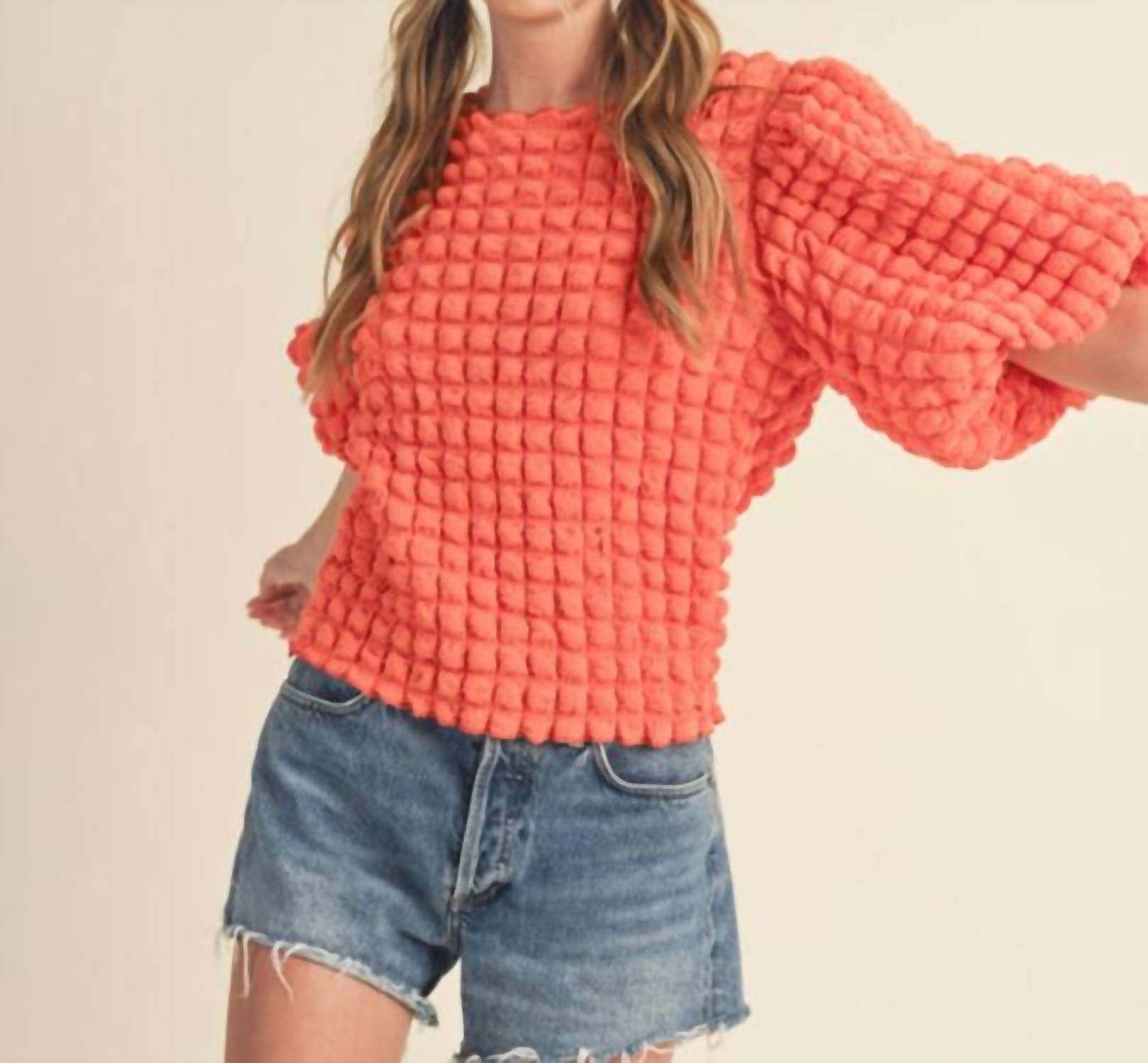 Introducing the Oasis Textured Balloon Sleeve Top by &merci, a vibrant addition to any closet. This blouse in a striking orange hue showcases elbow-length puff sleeves for a trendy, voluminous look. Made from a soft, textured bubble knit, it features a relaxed silhouette that's effortlessly chic. With its pull-on closure and crewneck design, this top offers both style and comfort for everyday wear.