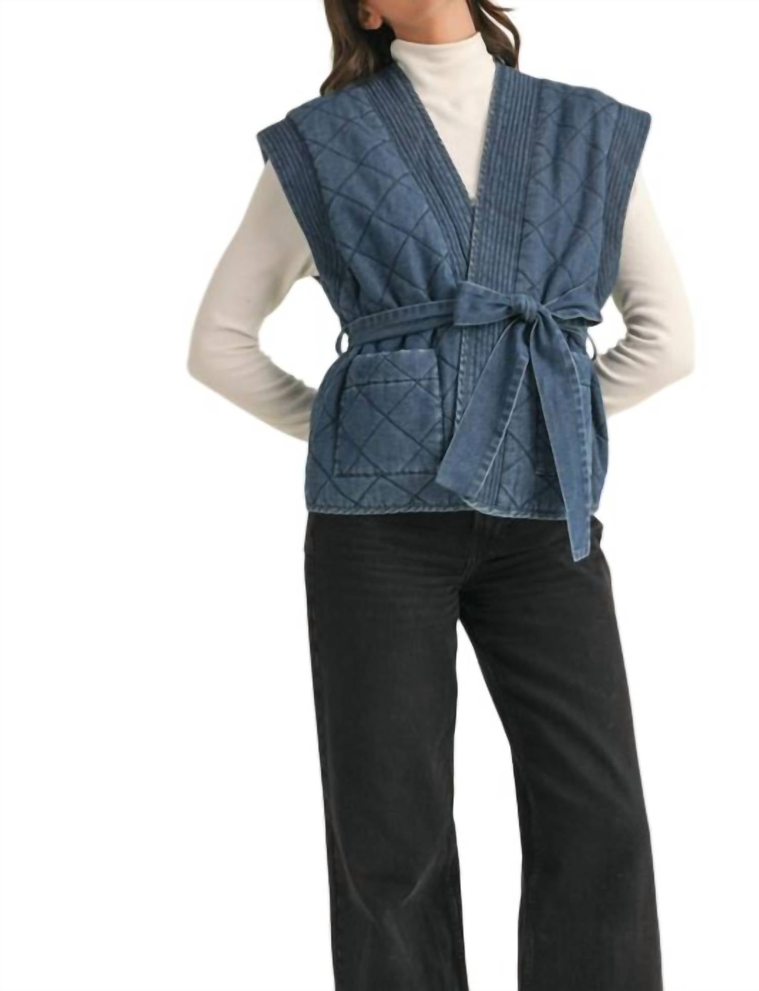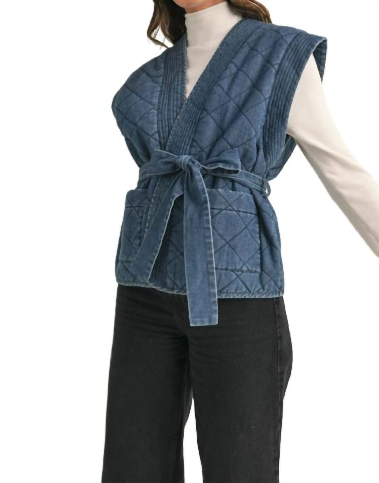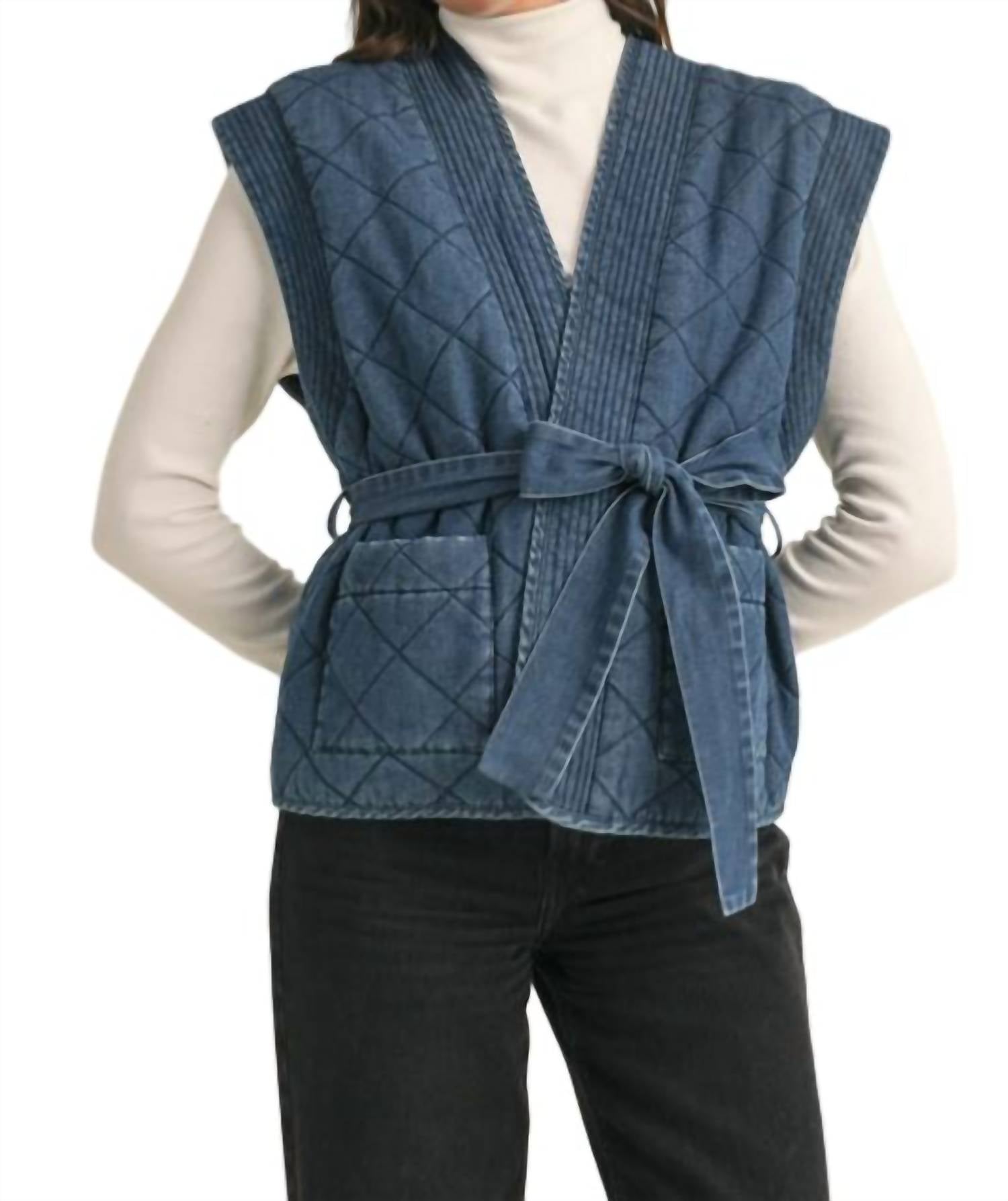 Throw this vest over an all black outfit for a perfectly polished look. Presenting the Quilted Denim Vest by &merci, a chic addition to your wardrobe with its stylish belted V-neck design. This sleeveless vest is crafted from quilted denim, providing both texture and warmth, perfect for layering. The tie closure adds a fashionable touch, while its versatile style ensures it complements a variety of outfits. Originating from an unspecified location, care instructions are not provided.