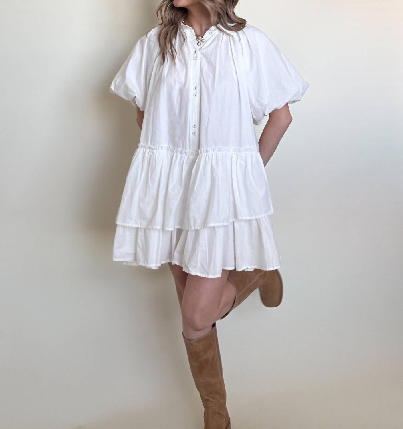 The perfect mini dress for those warmer months. Crisp white hue, perfect for a fresh and stylish look. Adorable mini dress features short sleeves. Crafted from 100% cotton for breathable comfort. Designed with a playful babydoll silhouette. Boasts a button closure, a collared neckline, and a tiered, flowy hem. Hand wash only.