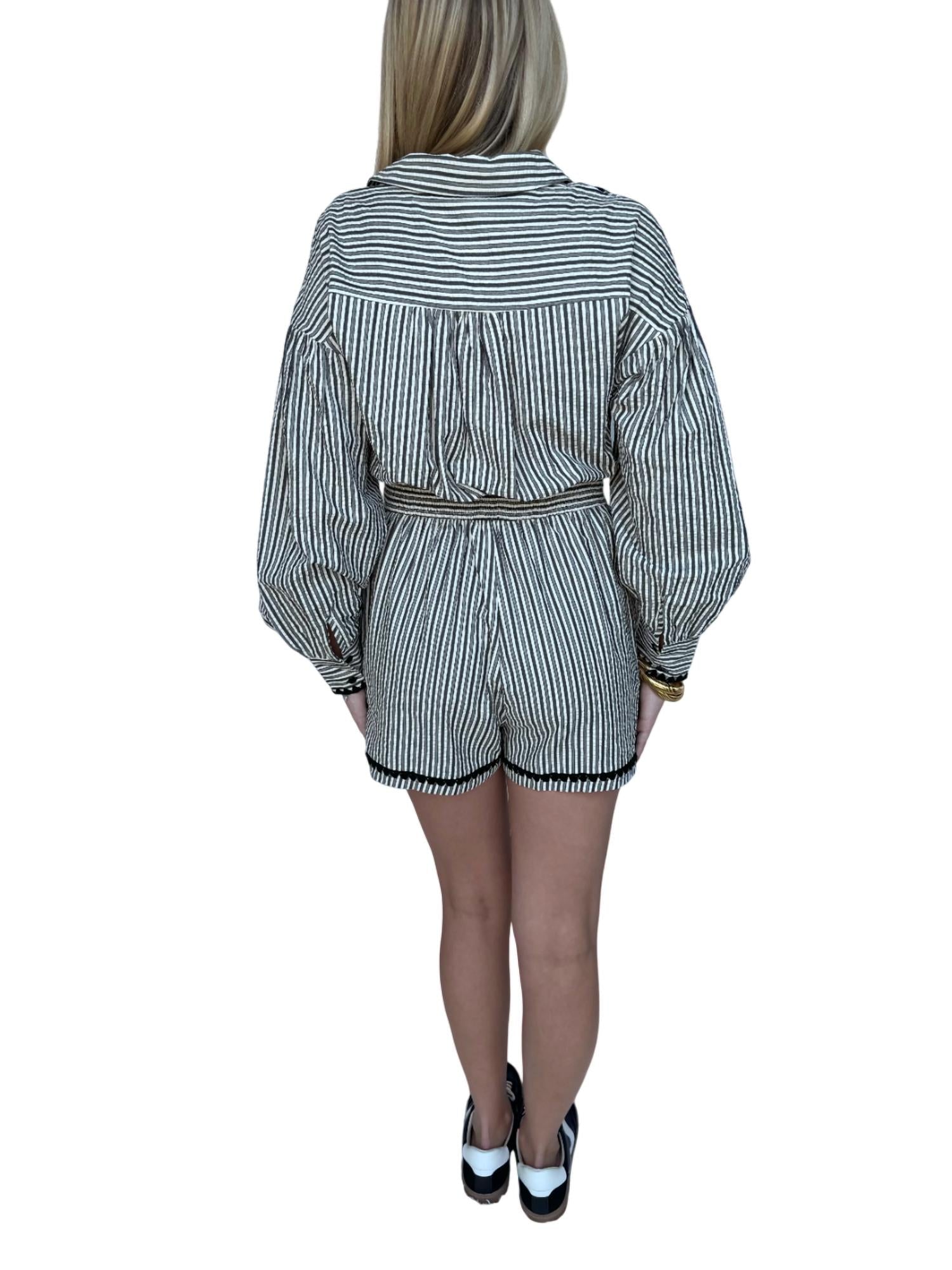 Throw it on and go! Introducing the Stripe Collared Neck Romper by &merci, a stylish addition to any fall wardrobe in classic Black/White. This women's romper showcases a chic stripe pattern and a collared neck, adding a touch of sophistication. The convenient pull-on closure and pocket feature enhance its versatility and comfort. Perfect for dressing up or down, this piece is a must-have for versatile styling.