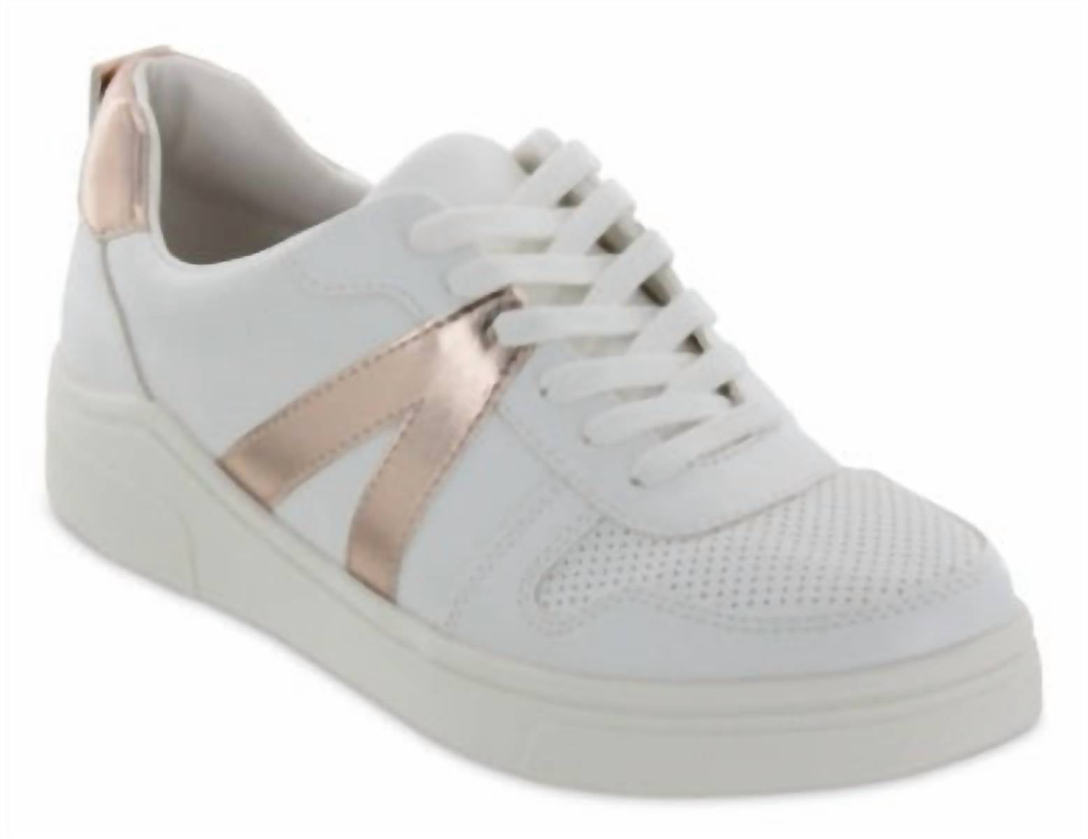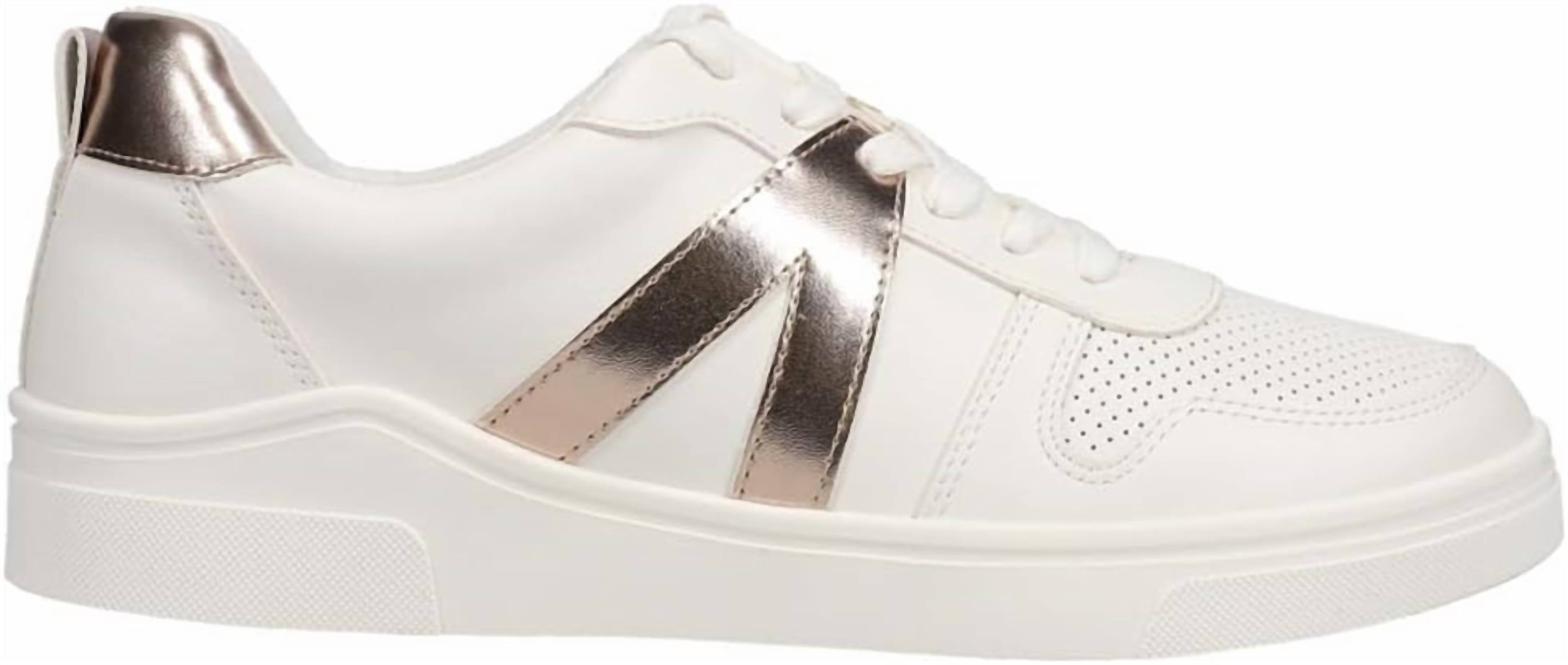 When fashion and function come together seamlessly.Features: Lace up front. White & rose gold. Pull on tab on back. Vegan leather upper. Color block V detail. Contoured footbed. Rubber sole. Man made materials