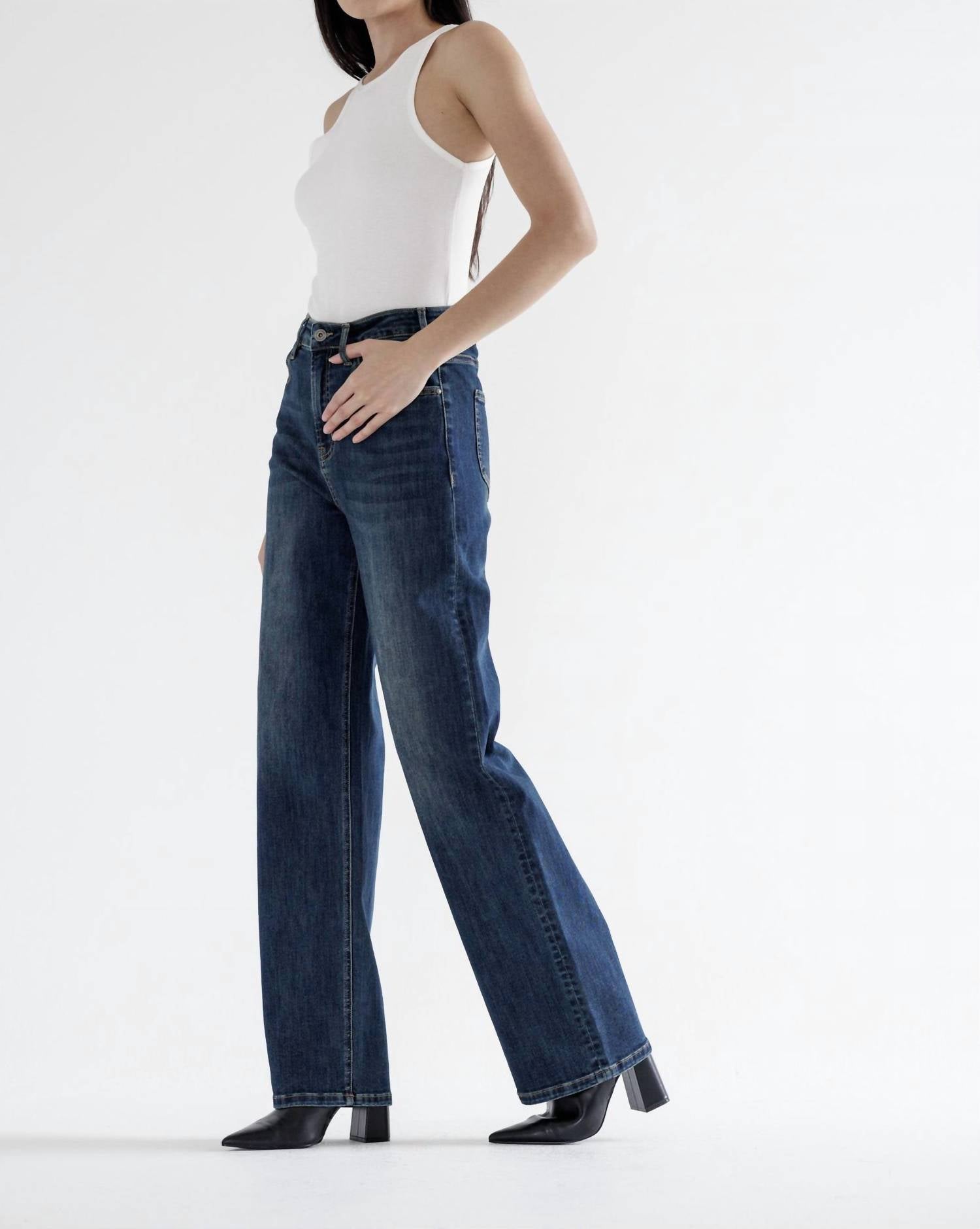 Step into relaxed style with the Freya Super High Rise Straight Leg Loose Fit Jeans by Mica Denim. Crafted from a cotton blend of 90.5% cotton, 7% polyester, and 2.5% spandex, these jeans offer a comfortable stretch and a super high rise for a flattering fit. With a warm dark wash perfect for autumns, they feature a button closure and a garment length of 44.25 inches. Easy to care for, they are machine washable and can be tumble dried.