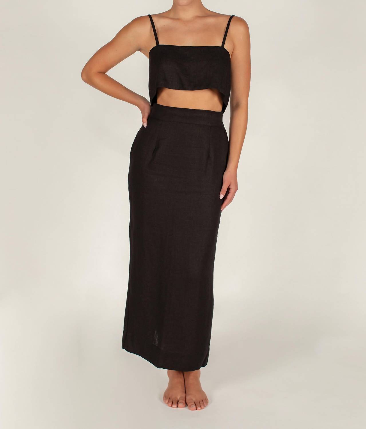 Introducing the Priya Top by MIKOH, a chic addition to your spring wardrobe that embodies quiet luxury. This sleeveless tank top is crafted from 100% hemp twill, featuring a sophisticated square neckline and a sleek pull-on design. Made in Indonesia, this black staple offers both style and sustainability. Care: Hand wash cold, dry in shade; avoid machine wash, tumble dry, and contact with sunscreens and oils. Model wears size 1 (5'11.5" height, 33.5" bust, 25" waist, 35.5" hips).
