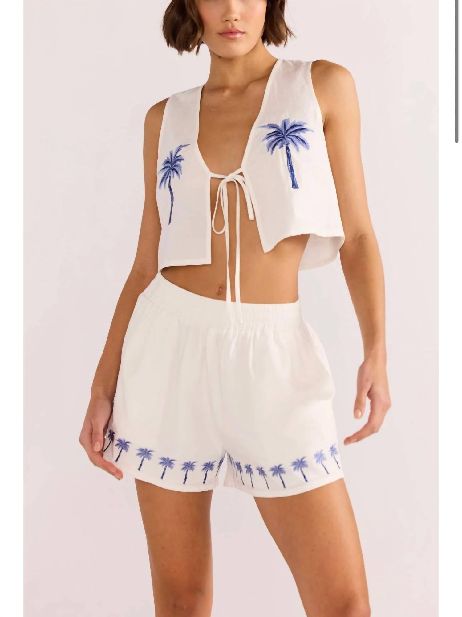 Pair this crop top with your favorite high-waisted jeans or maxi skirt. The Isadora Embroidered Top by MINKPINK is your go-to summer staple, offering a sleeveless, laid-back style perfect for vacation vibes. Made in a blend of 65% Cotton, 30% Viscose, and 5% Linen, this crop top features an embroidered palm print design that adds a playful edge. It boasts a V-neckline and a tie front closure for a relaxed fit. Accent your beach look with this minimalist piece, ideal for layering over a bikini.