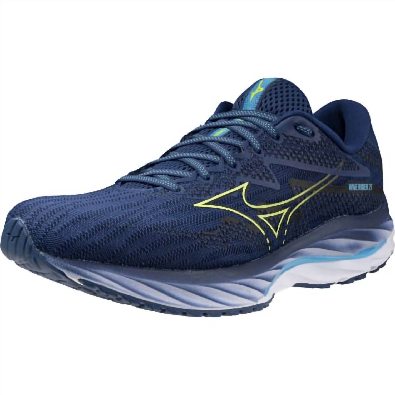 Experience enhanced performance with the Men's Rider 27 Shoes by MIZUNO, crafted for the active man. These athletic shoes showcase a sleek design in Navy Peony and Sharp Green, featuring a durable rubber construction. Designed with a comfortable round toe shape, these shoes cater to the demands of adult athletes. Perfect for running or casual sports, the Rider 27 offers both style and functionality.