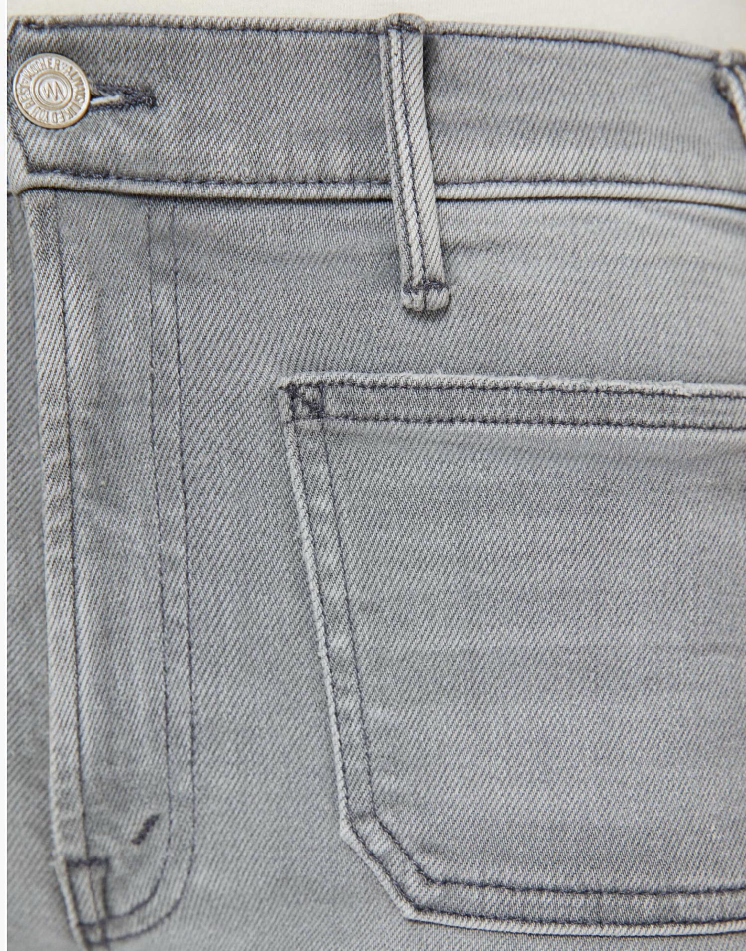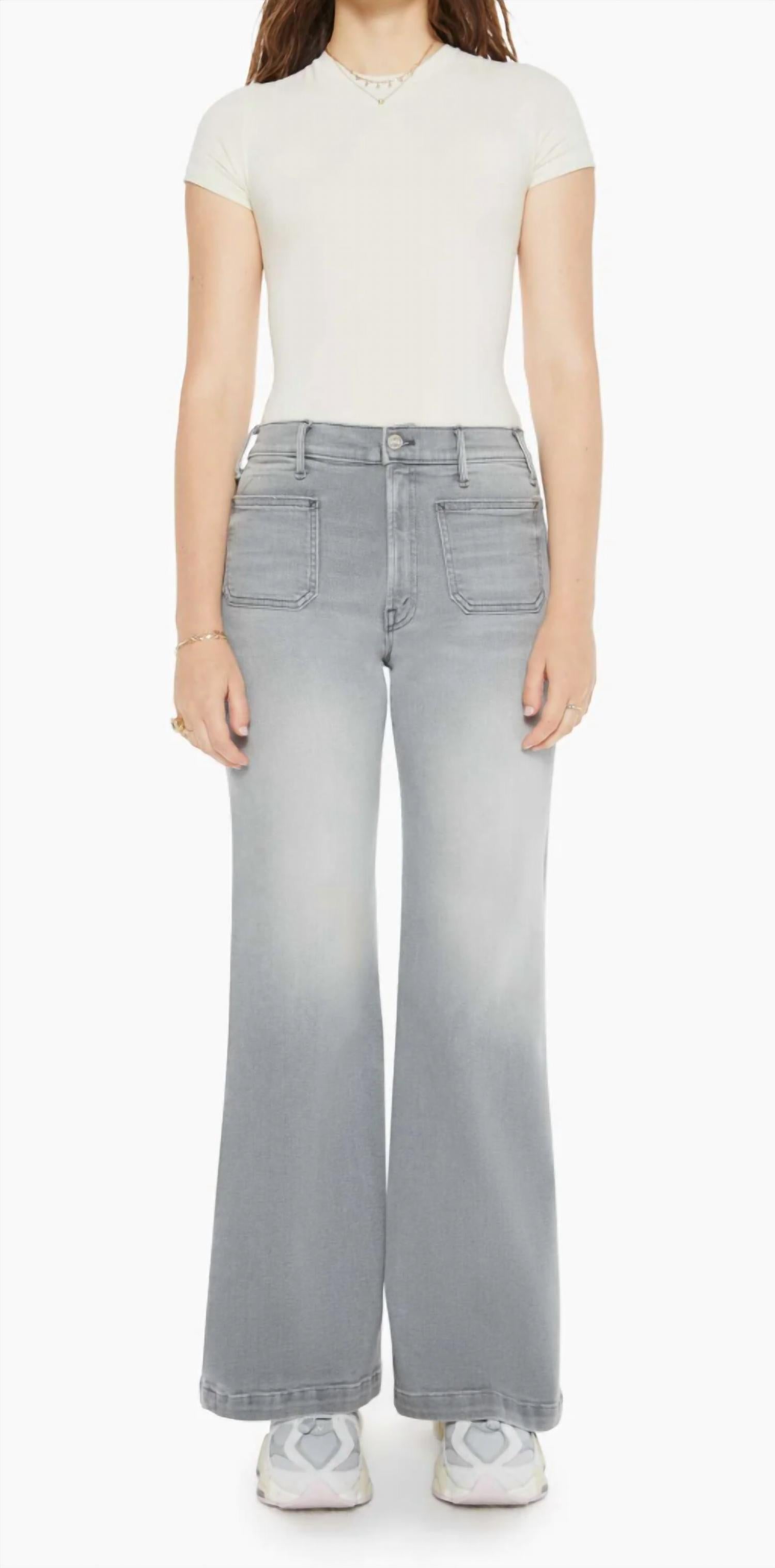Introducing the Hustler Roller Patch Pocket Wide Leg Pants by Mother, a true homage to 70s fashion with a modern twist. These women's wide-leg jeans, available in the soft light grey shade "Noted," feature a high rise, patch pockets, and a 33-inch inseam for a flattering relaxed fit. Crafted in Los Angeles from stretch denim, they are designed to move with you. Closure: Button closure. Care: Machine wash and tumble dry.