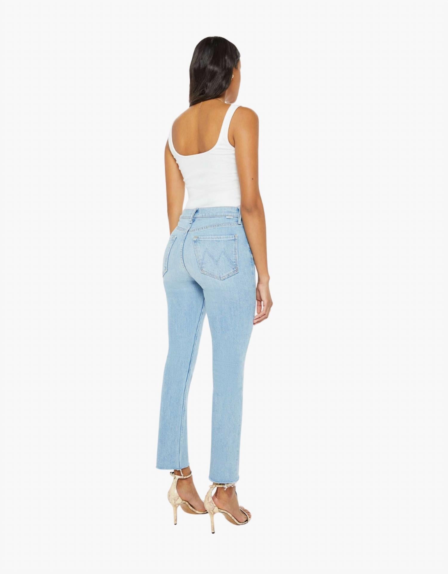 Meet the Pixie Dazzler Ankle Fray Jeans by Mother, a chic choice for those who love the high-rise style with a modern edge. Made from a durable cotton blend consisting of 97% cotton, 2.5% polyester, and 0.5% elastane, these jeans offer a classic straight leg fit in the Ivy League Cowboy light blue wash. They are crafted in Los Angeles with imported materials and feature an exposed button closure, along with a distinctive frayed ankle-length hem. Rise: 11", Inseam: 27.5", Leg Opening: 13". Machine wash.