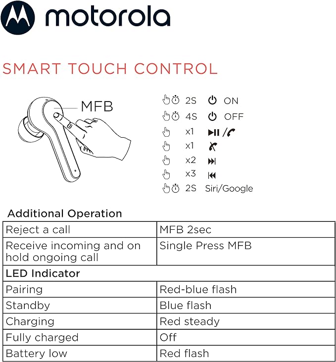 TRUE WIRELESS EARBUDS: Motorola wireless earbuds are designed with comfort in mind and portability to use anywhere for multitasking. These affordable water resistant ear buds with totally 15 hours of playtime offer superior sound and handsfree calling. | HANDS-FREE CALLING: Wireless earbuds for phone calls feature a built-in microphone in each ear bud for use together as pair, or as mono headset. Smart touch-control for calls, volume, skip and voice command are ideal travel accessories for work or school. | IPX5 WATER-RESISTANT: Designed for everyday use, these Bluetooth earphones help resist sweat, moisture, and the elements to ensure a crystal clear sound experience for travel. These ear buds make a great gift for everyone.