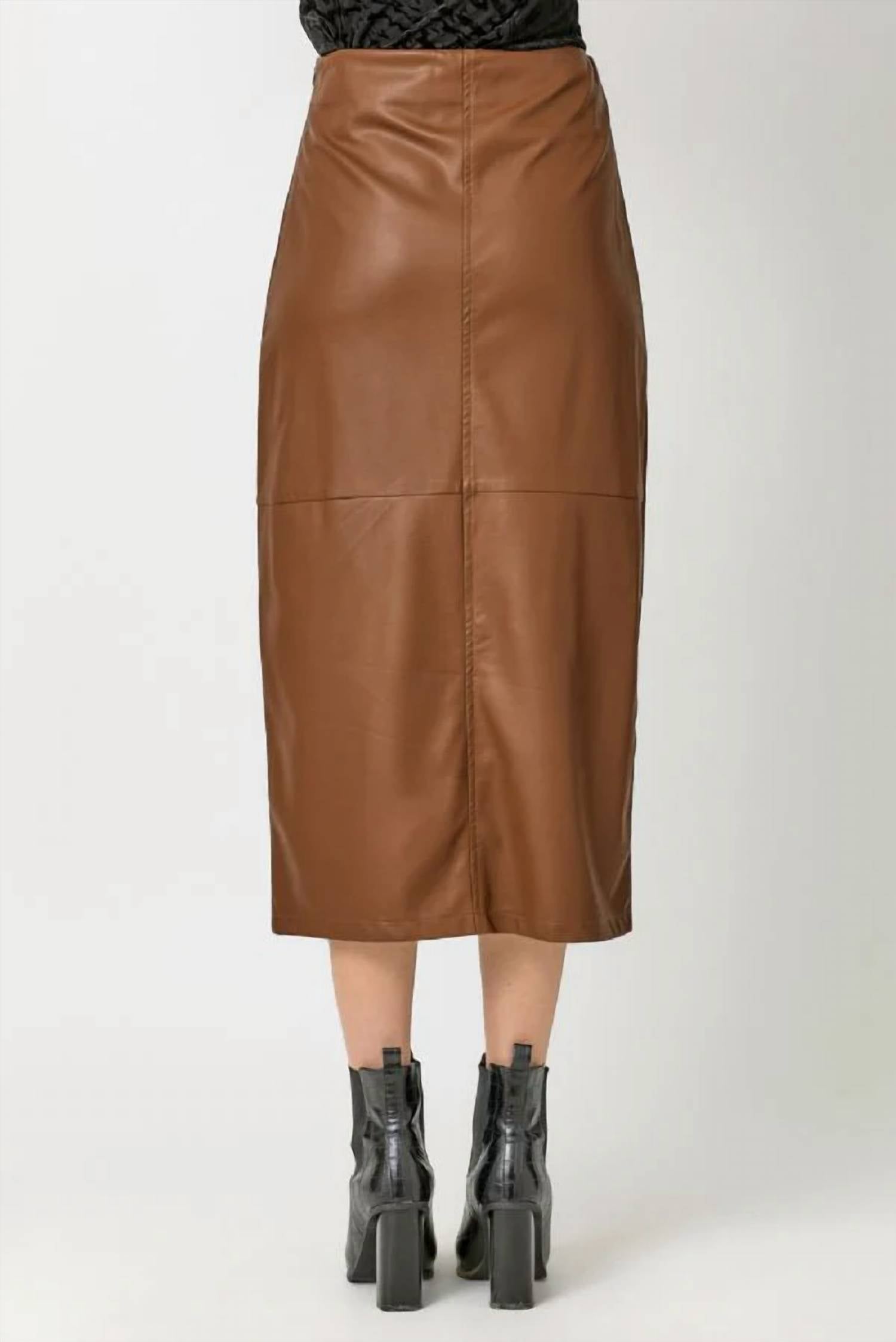 Dress this pencil skirt up with a blazer or down with your favorite tee. So versatile and timeless. Elevate your evening attire with the Faux Leather Pencil Skirt by Mystree, perfect for a minimalist fall look. Crafted from 55% Viscose and 45% Polyurethane, this brown skirt offers a flattering midi length with a chic front slit. The solid pattern and side zipper closure enhance its sleek silhouette. Care instructions: Hand wash and line dry.