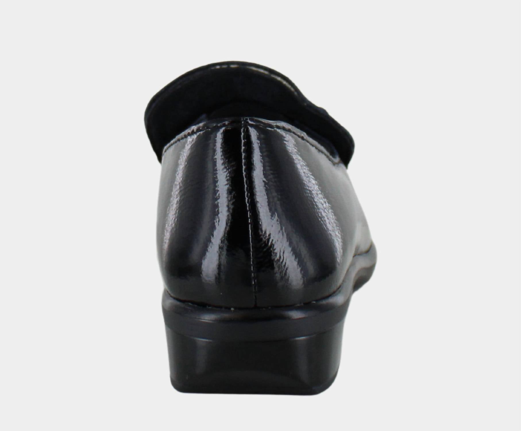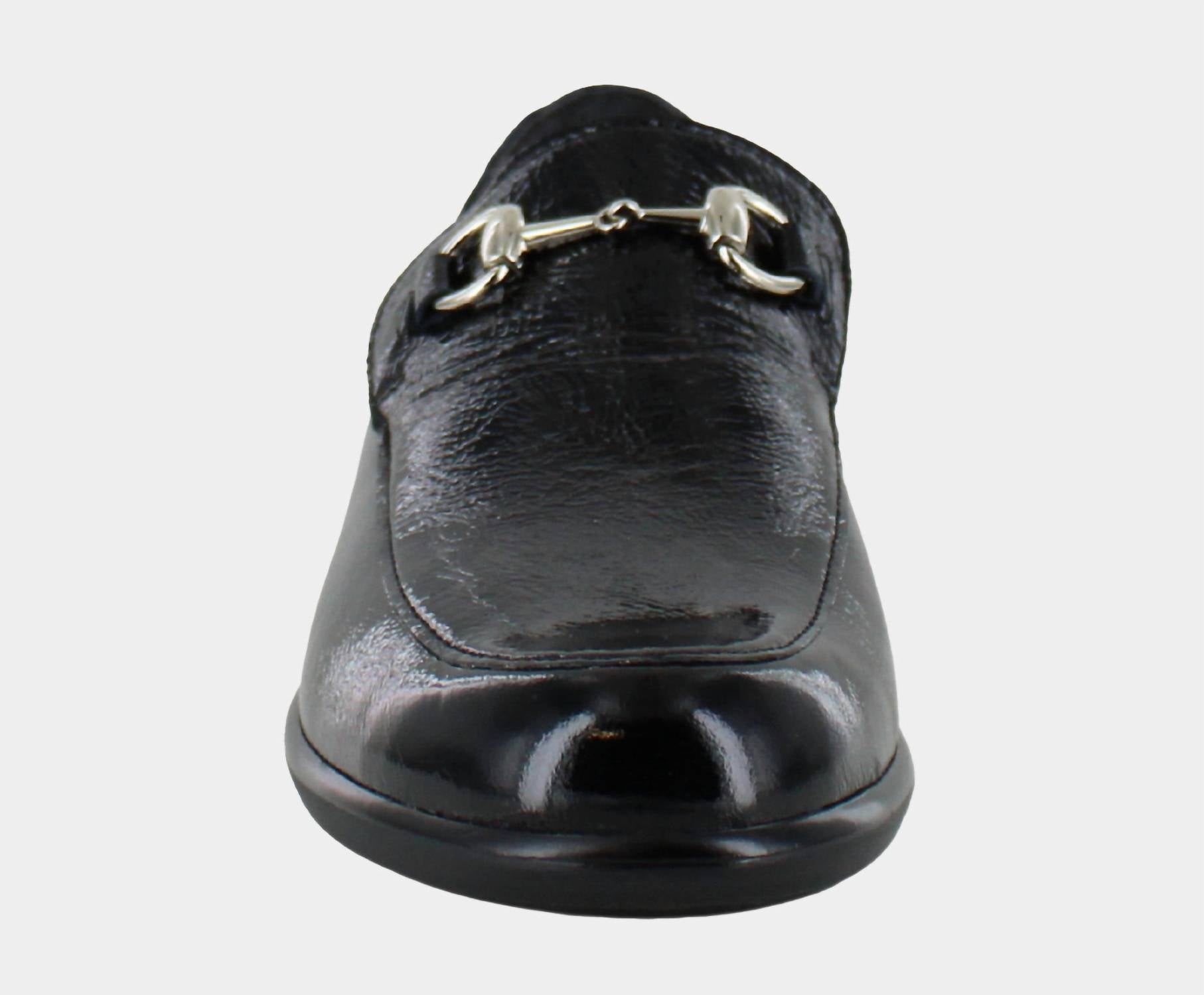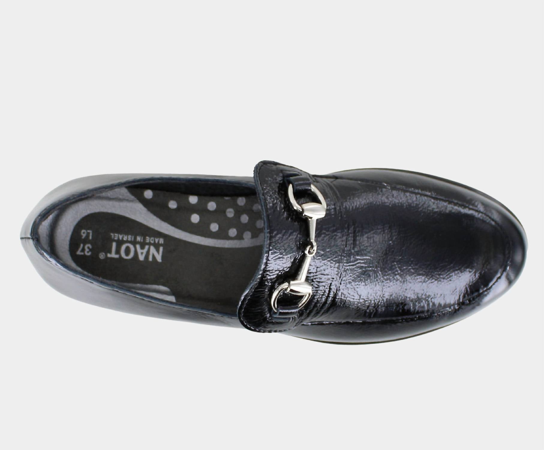 A classic loafer that is both comfortable and polished. Introducing the Bentu Aura Loafer by NAOT, a classic and timeless shoe in Black Crinkle Patent designed for women. This flat heel loafer features a round toe and is complemented with elegant silver tone hardware. It includes Naot's removable cork and latex footbed and an abrasive sole for enhanced traction. Ideal for adult wear, these loafers are crafted to provide comfort and style without the added height of a heel.
