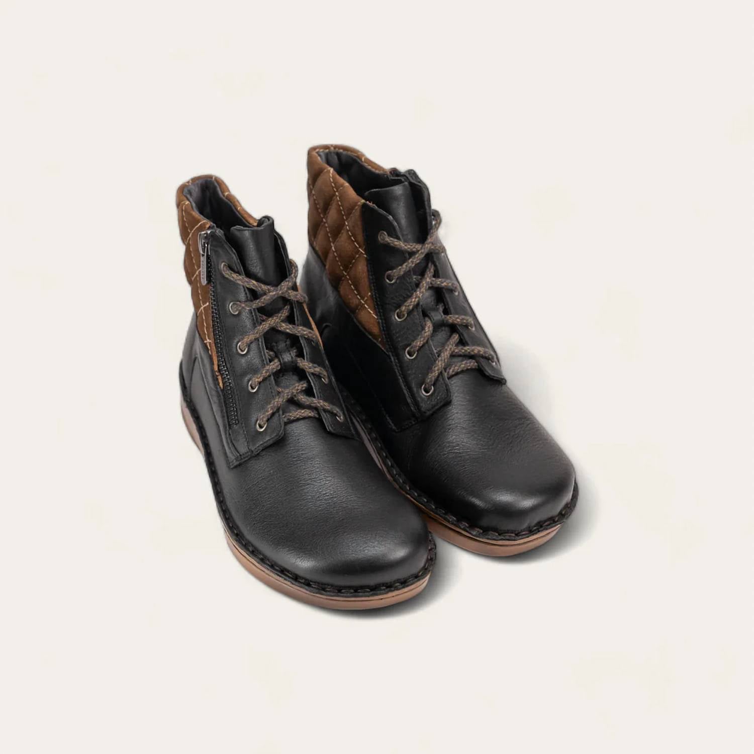 Say hello to the perfect, most versatile boot. The ankle height makes this style easily transition from day to night. Wear them with your favorite skinny jeans and tee for a more laid back look, or pair them with your favorite mini dress and jacket for a night out on the town. Introducing the Women's Castera Ankle Boot by NAOT, crafted in a chic Soft Black and Antique Brown leather combination, perfect for everyday wear. The ankle boot features a convenient lace-up closure with a zipper accent and quilted details, complemented by a block heel standing at 1.25 inches. Its slip-resistant, orthotic-friendly design includes a sole made from durable polyurethane, and the footbed is an anatomic cork and latex wrapped in pampering suede. This boot proudly holds the American Podiatric Medical Association (APMA) Acceptance, ensuring optimal foot health.