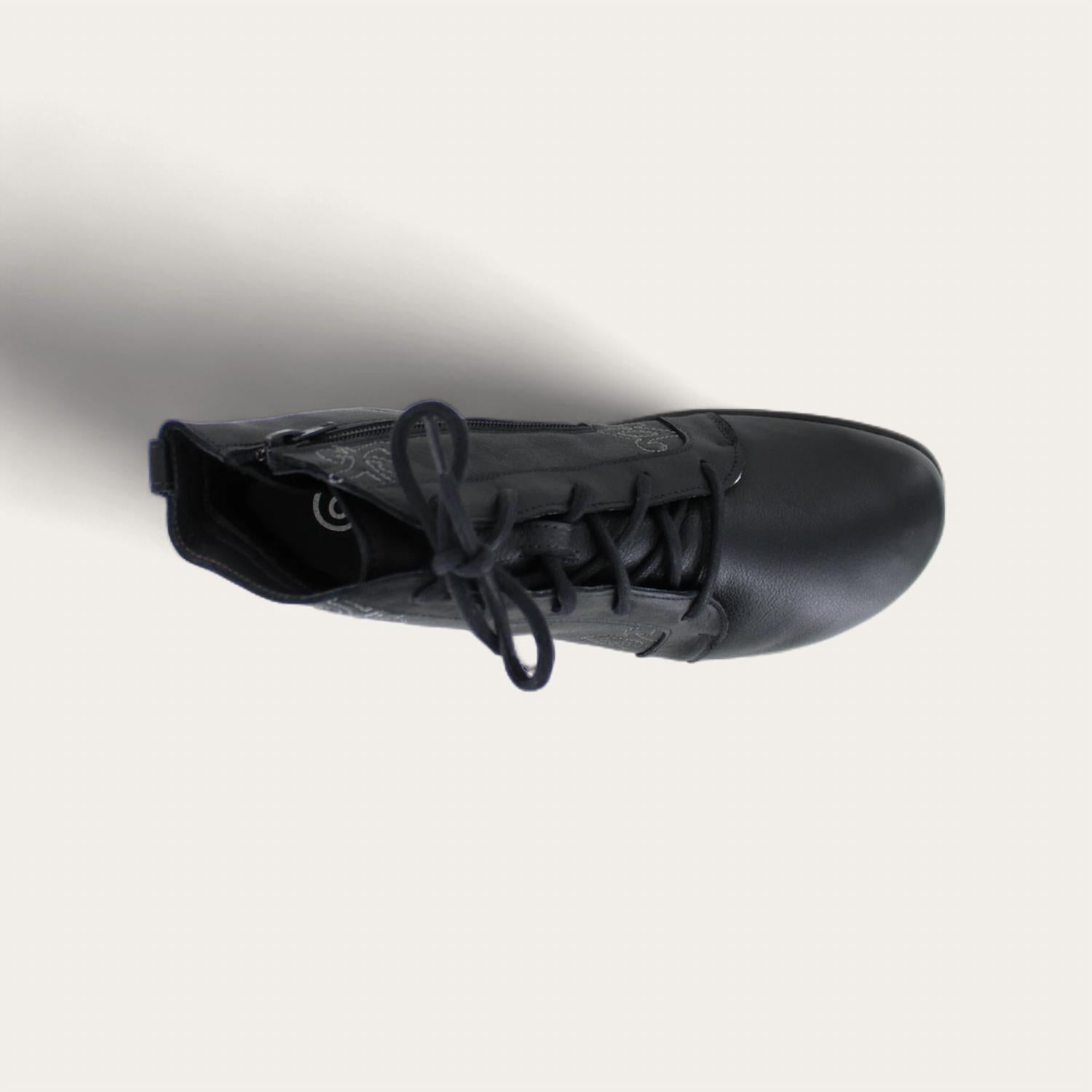 Say hello to the perfect, most versatile boot. The ankle height makes this style easily transition from day to night. Wear them with your favorite skinny jeans and tee for a more laid back look, or pair them with your favorite mini dress and jacket for a night out on the town. Designed with a lace-up closure and featuring beautiful embroidered details, this bootie includes a removable, anatomic cork and latex footbed that molds to your foot. The 1" heel provides a flat yet supportive lift, while the rubber sole ensures durability and slip resistance. Ideal for those seeking comfort and flexibility, these booties are true to size, with half sizes advised to size up.