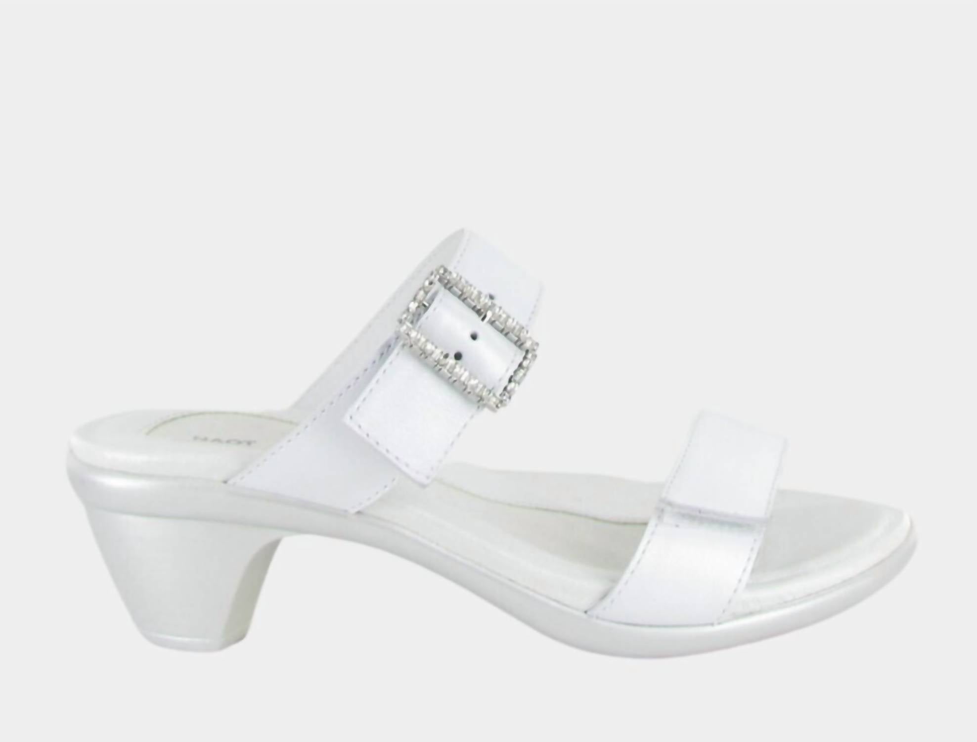 Classicly cute and all-day-wearable. We love this sandal.This Recent Heeled Slide Sandal features a jeweled buckle on a padded front strap and a secure hook and loop ankle strap. It has a 2-inch block heel, a TPR sole with a metal shank, and offers a medium width for all-day comfort.