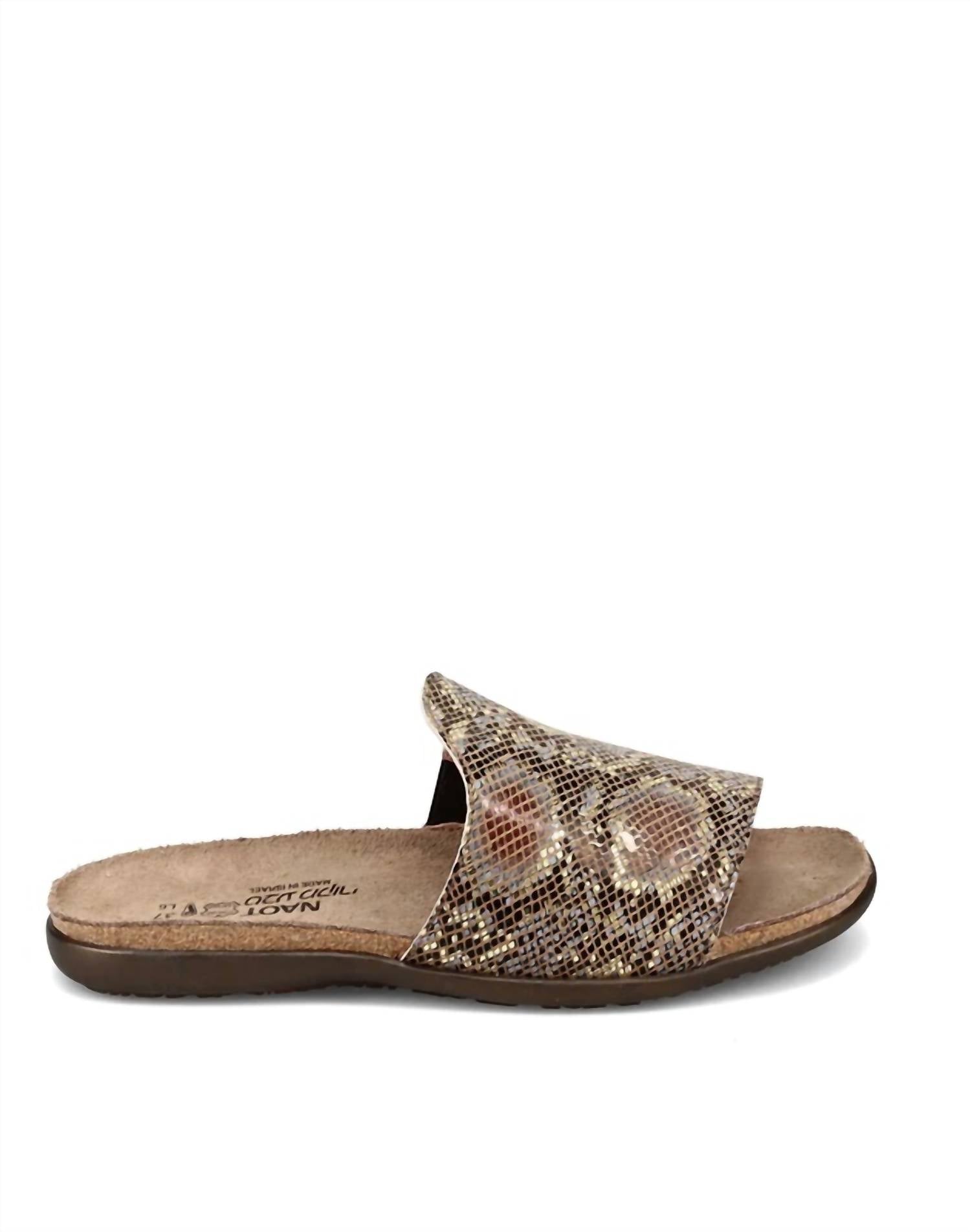 Flowy dresses, cropped pants, and even jumpsuits... this sandal works with them all!From the Elegant Flats collection. Smooth leather lining. Anatomic cork and latex1" heel. Color: Golden Python Leather (EC7).