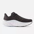 Experience exceptional cushioning with the Women's Fresh Foam X More V4 Running Shoes by New Balance, crafted for neutral runners. Boasting a lightweight, breathable upper in sleek black, these medium-width shoes are perfect for fitness and athleisure occasions. The innovative Fresh Foam X midsole, with approximately 3% bio-based content, measures a forefoot height of 31 mm and a heel height of 35 mm, providing a soft running experience with a 4 mm offset. Designed with a round toe shape, the wider platform enhances support, while the durable outsole offers stability and structure for a smooth, comfortable run.