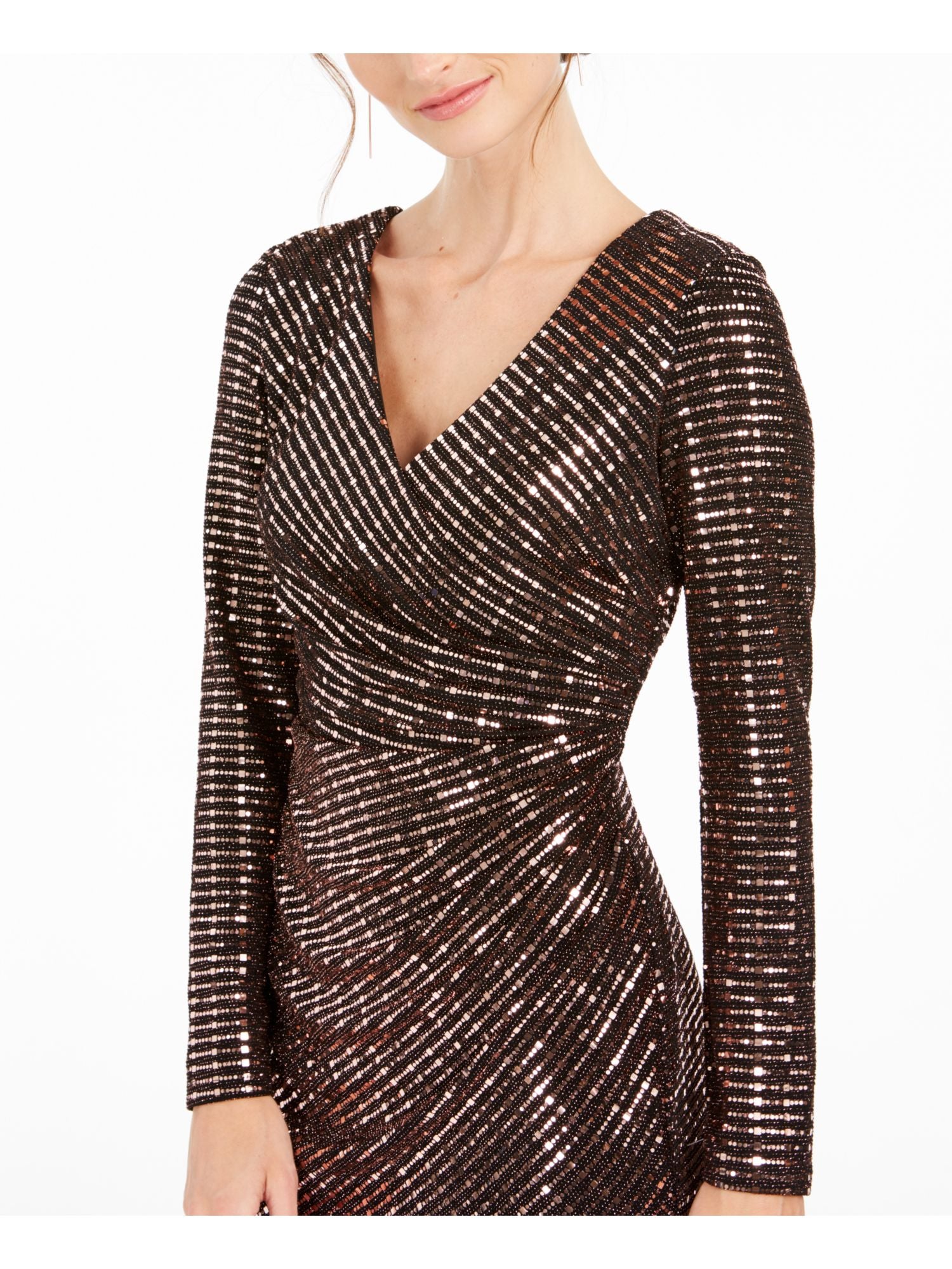 Nightway Women's Sequined Long Sleeve V Neck Knee Length Tulip Cocktail Dress Brown Size 14