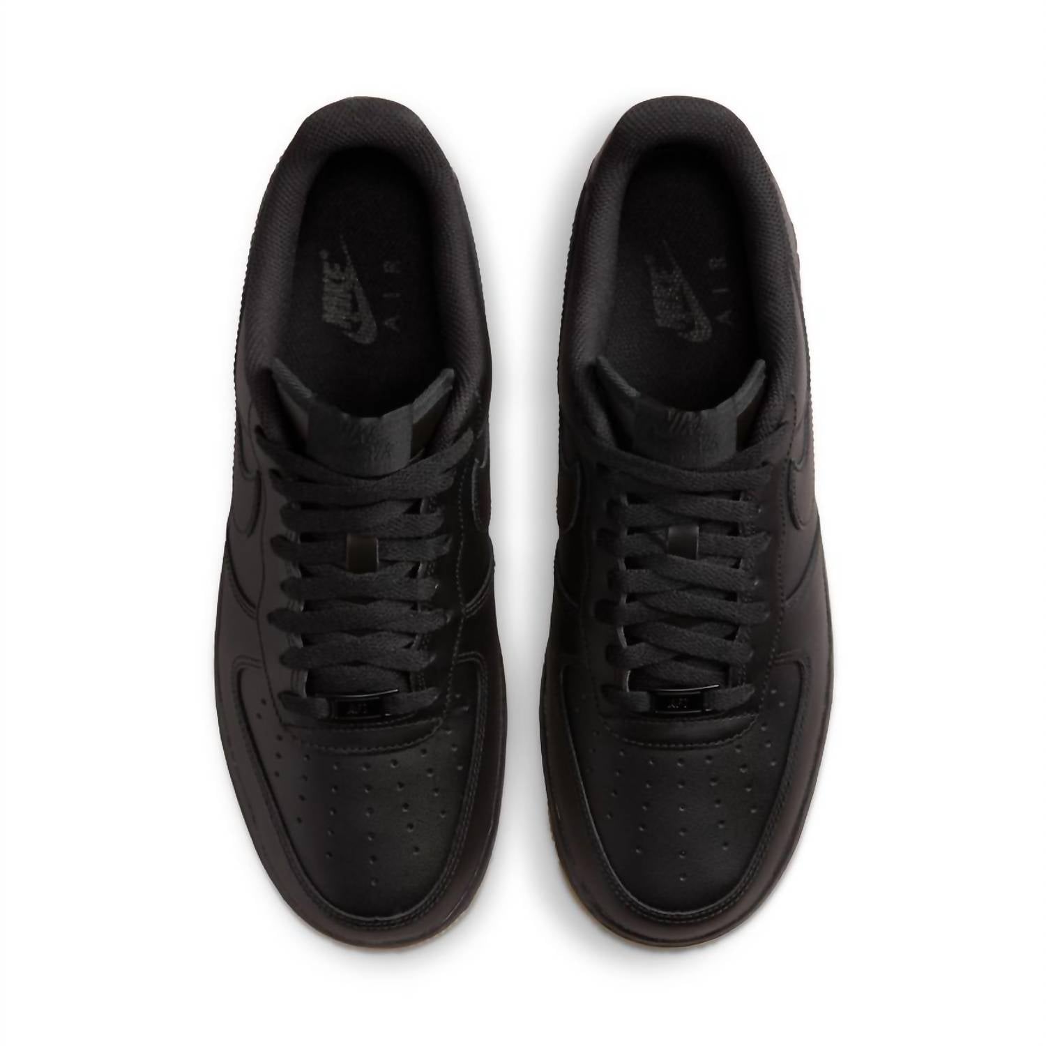 This Air Force 1 ’07 Black Gum sneaker features a leather composition, low-cut design, and padded collars for comfort. With Nike Air cushioning, a durable rubber outsole, and perforations for breathability, it offers both style and functionality.