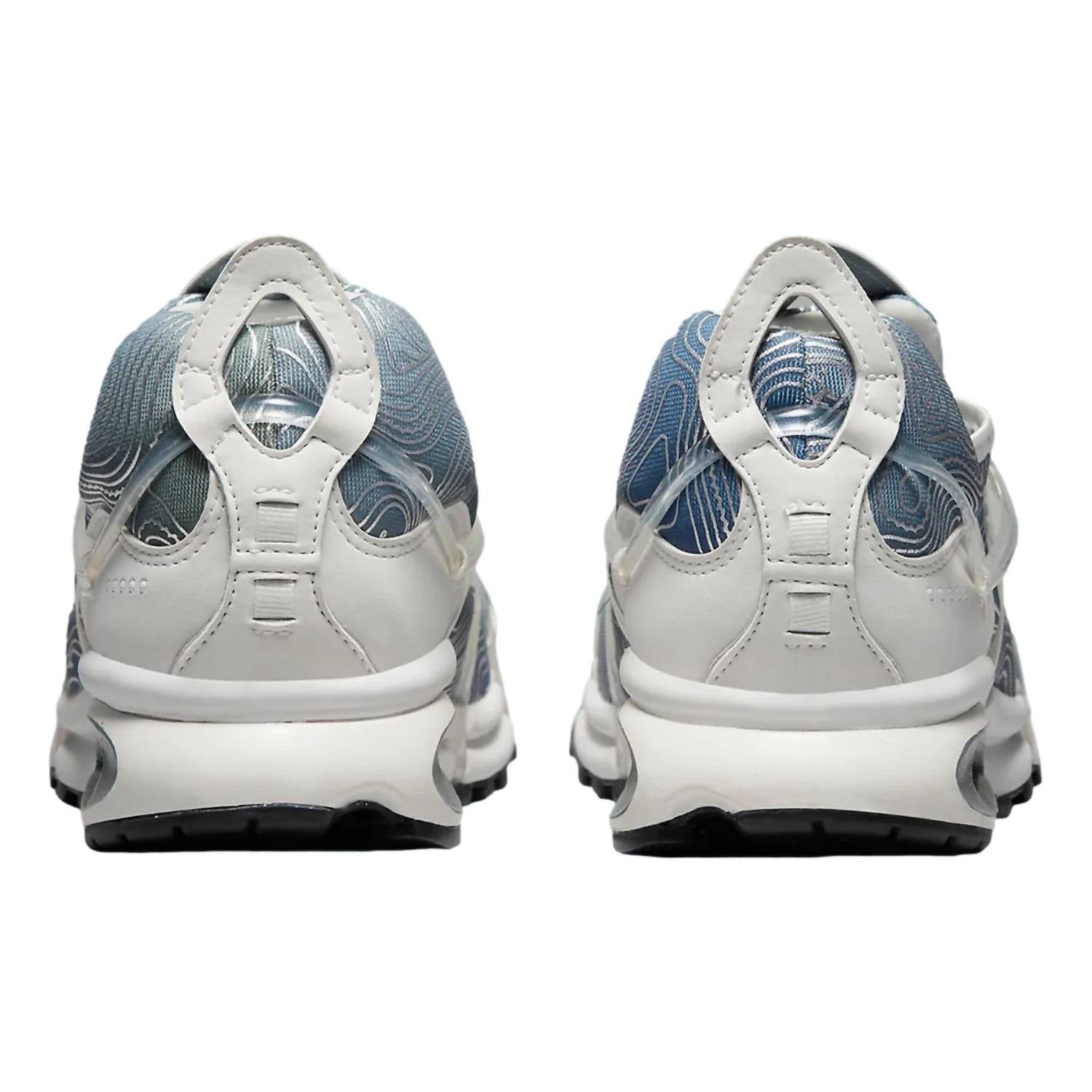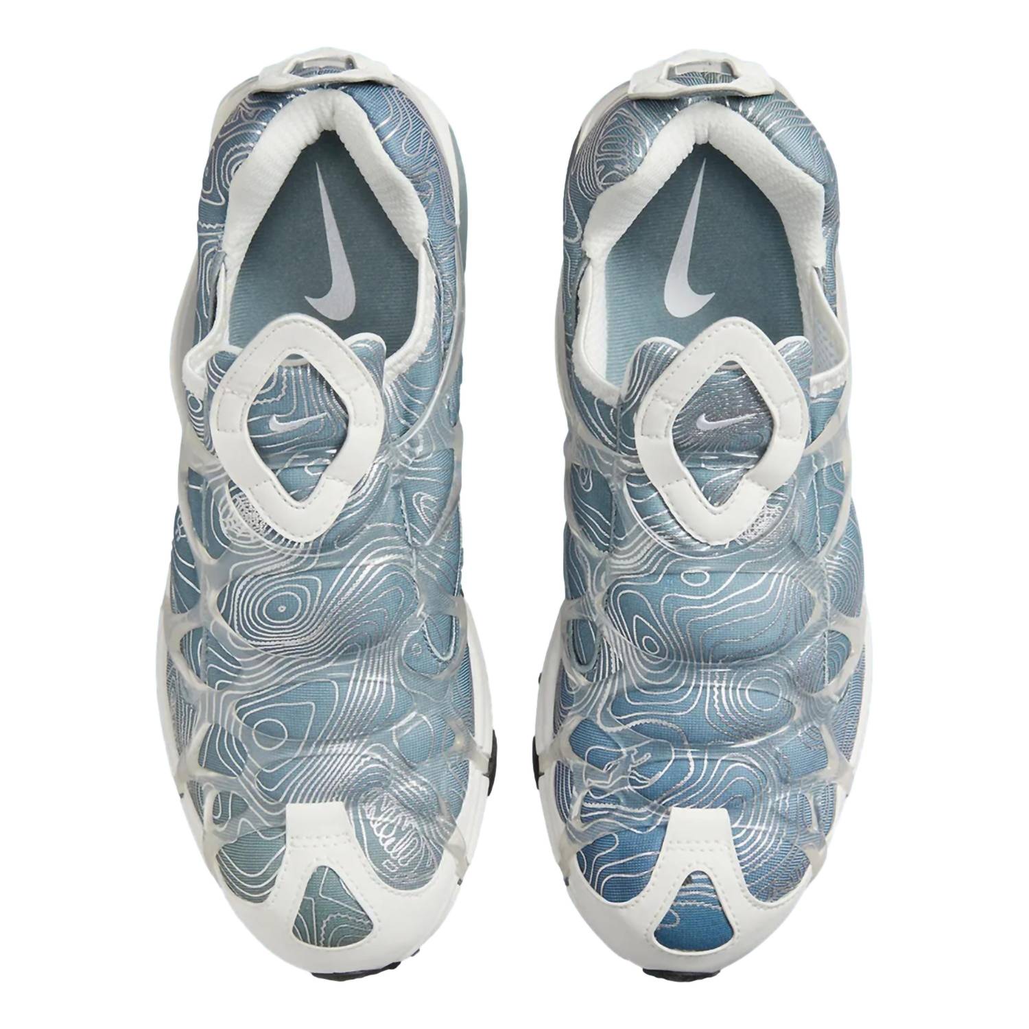 Stretchy neoprene-like fabric. All-over topographical print. Outdoorsy colors: Summit White and Treeline Green. Webbed support system. Visible Air cushioning for comfort and performance.