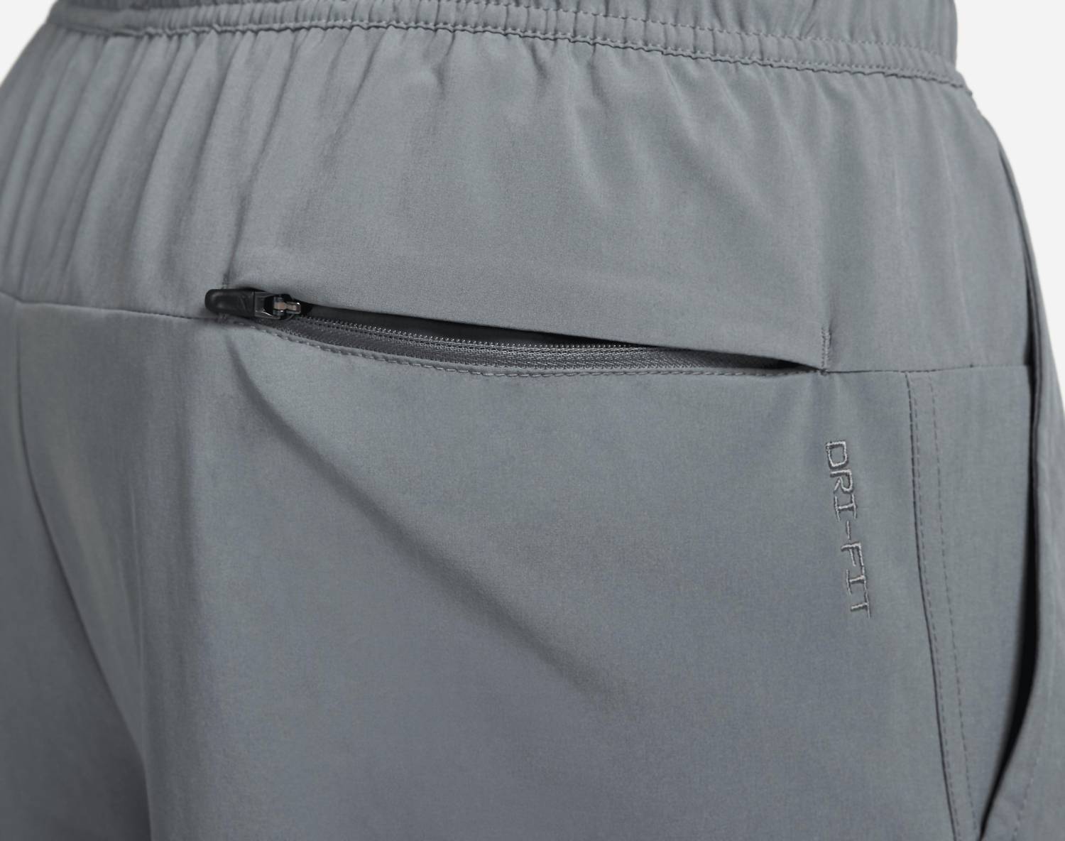 Introducing the Men's Unlimited Dri-Fit Shorts by NIKE, designed for maximum versatility and performance in Smoke Grey/Black/Smoke Grey. These 9" unlined shorts feature a pull-on closure and are crafted from 86% polyester, 14% spandex with 4-way stretch woven fabric, ensuring comfort and freedom of movement. Made for running, yoga, and training, they include essential side pockets and a large zippered back pocket for secure storage. Additional details like a stay-in-place waistband with convertible drawcord and embroidered Swoosh mark these shorts as both highly functional and stylish. Care instructions: Machine wash. Origin: Imported. Manufacturer ID: DV9330-084.