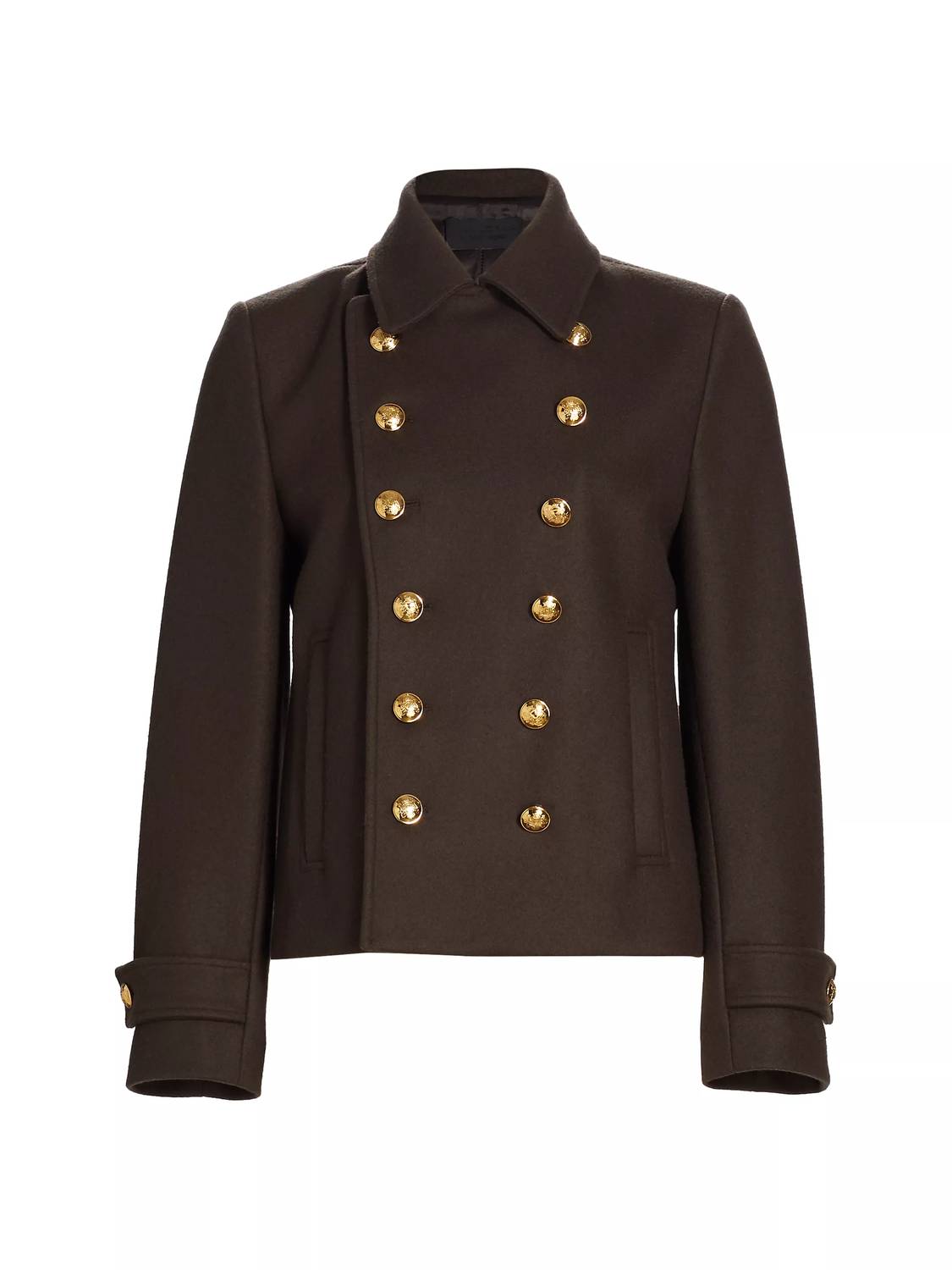 Introducing the Ornella Cropped Peacoat by NILI LOTAN, a sleek addition to your winter wardrobe. With a straight, cropped silhouette crafted in 100% Virgin Wool, this peacoat ensures both comfort and warmth. The design features elegant gold signature crest buttons for the button closure and is tailored with princess seams and welt pockets for refined shaping. The long sleeves, complete with tab details at the cuffs, and the fully lined interior provide a sophisticated touch, all in a luxurious cocoa hue.