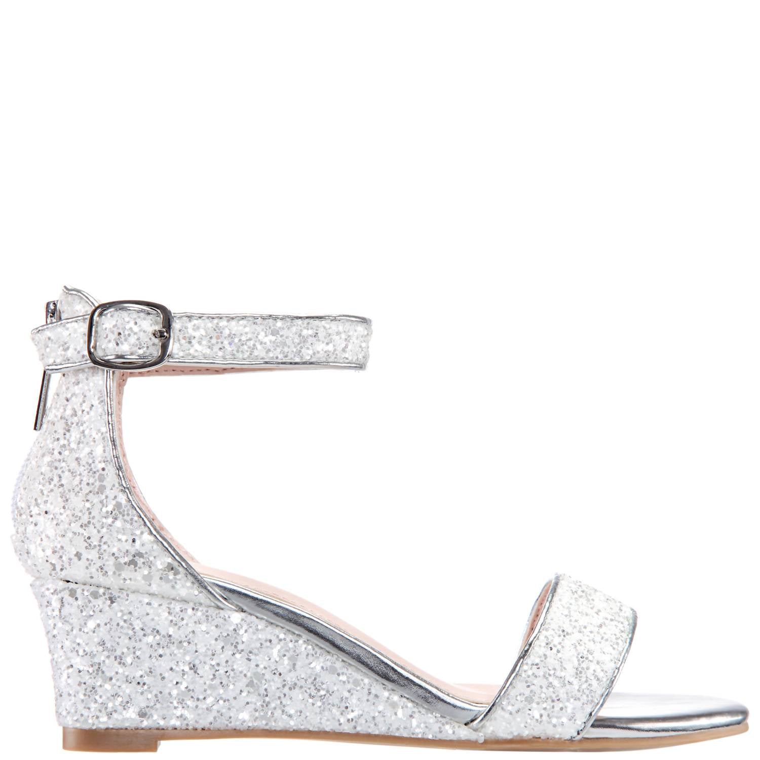 Step into our chunky glitter KRISTINA wedge sandal with easy-on back zipper detail. This style is sure to make her day magical. Decorative buckle. Cushion comfort memory foam insole. Flexible TPR outsole. Man-made upper and lining material. Heel height: 1.75".