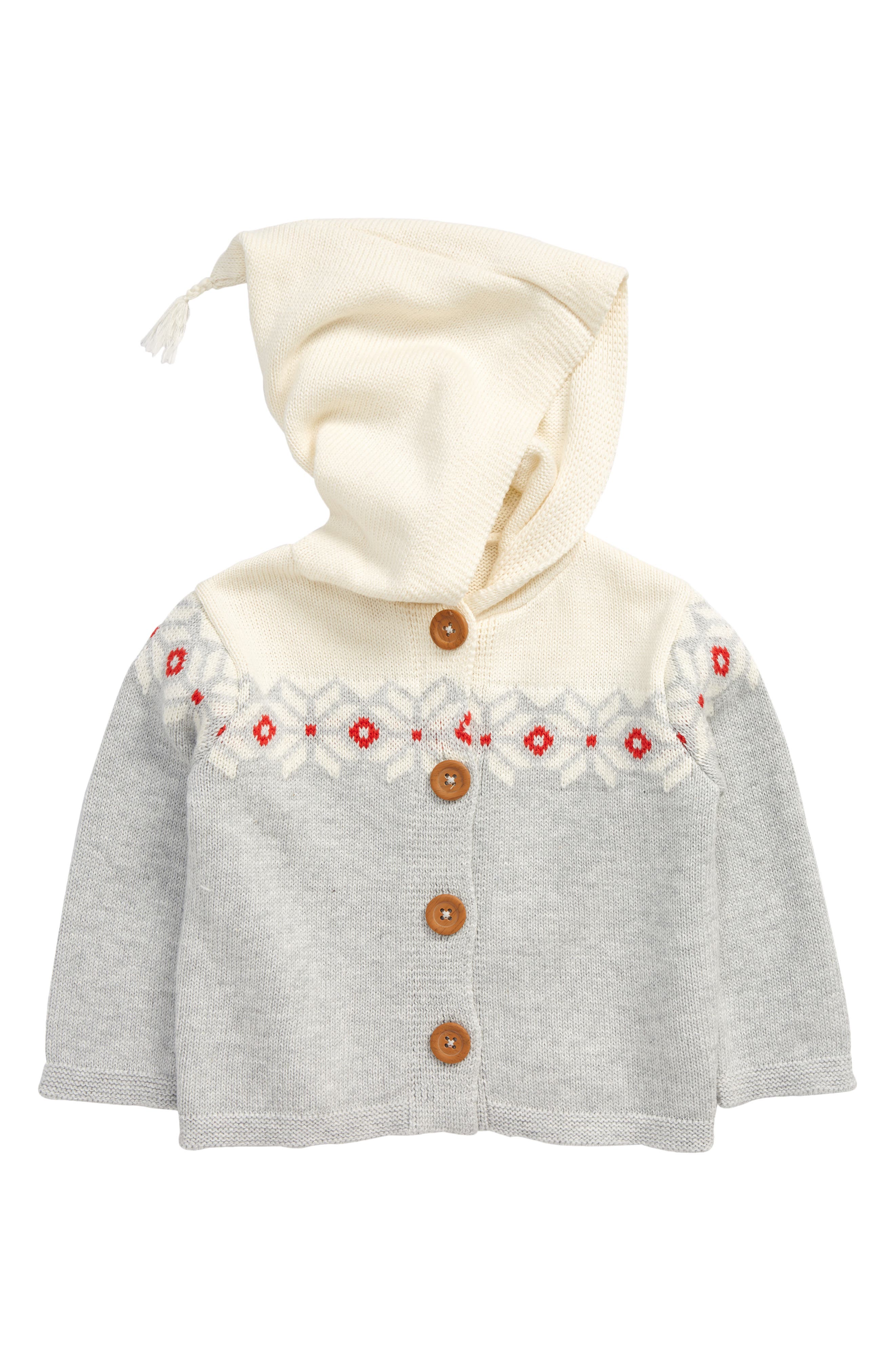 The Nordstrom Pattern Hoodie Cardigan is a cozy and stylish outerwear piece designed specifically for infants. Made from 100% organic cotton, this cardigan is gentle against the baby's skin and provides warmth during chilly weather. The light heather grey color is complemented by a charming fairisle pattern, adding a touch of whimsy. Featuring rustic wooden buttons, it offers a vintage-inspired look while ensuring easy dressing. The design is both practical and aesthetically pleasing, making it suitable for various occasions, whether at home or out and about. This cardigan is machine washable for easy care and is a wonderful addition to any baby's wardrobe.