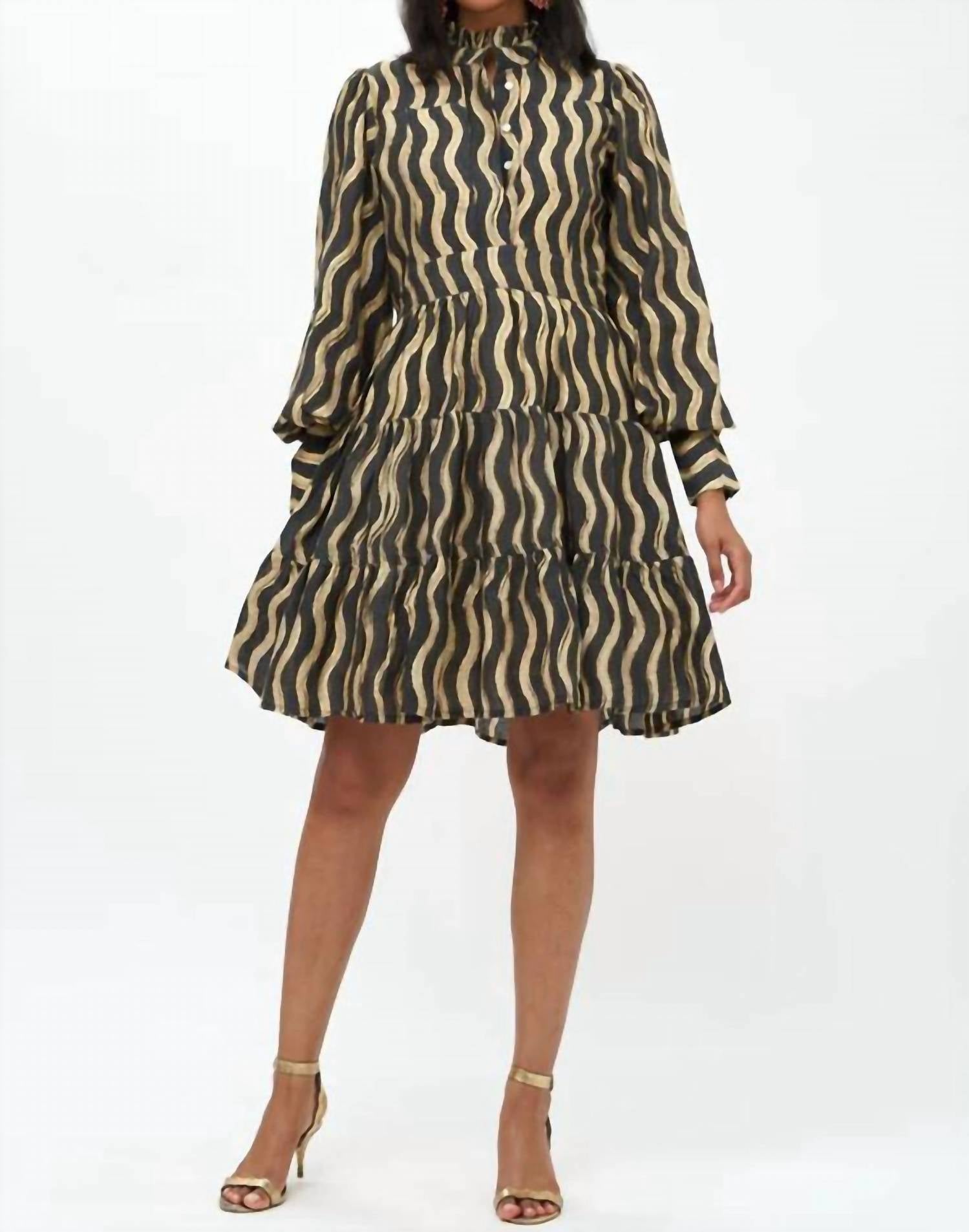 The kind of easy and flattering dress you'll be reaching for all season long.This mini dress is made from luxurious silk and cotton, featuring hand-blocked gold paint detailing. It has a split V-neck collar, is fully lined, and includes a side zipper. The dress has balloon sleeves with extended cuffs and button detailing. The model is 5'8" and wearing a size Small. Care instructions: wash on a cold delicate cycle.
