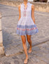 Introducing the Oliphant Yoke Mini Dress in Borrego Navy, an alluring choice for a standout Boho Chic look. This sleeveless, tiered A-line design is made from 100% cotton, featuring hand block printed micro patterns and contrast prints. The dress flaunts a split V neckline with a pleated ruffle detail at the collar, extending to an above-the-knee length. Closure is a discreet side zipper, and it is fully lined for comfort. Care for this piece by hand washing cold with gentle detergent, and lay flat or hang dry, turning inside out before washing. Perfect for a summer vacation.