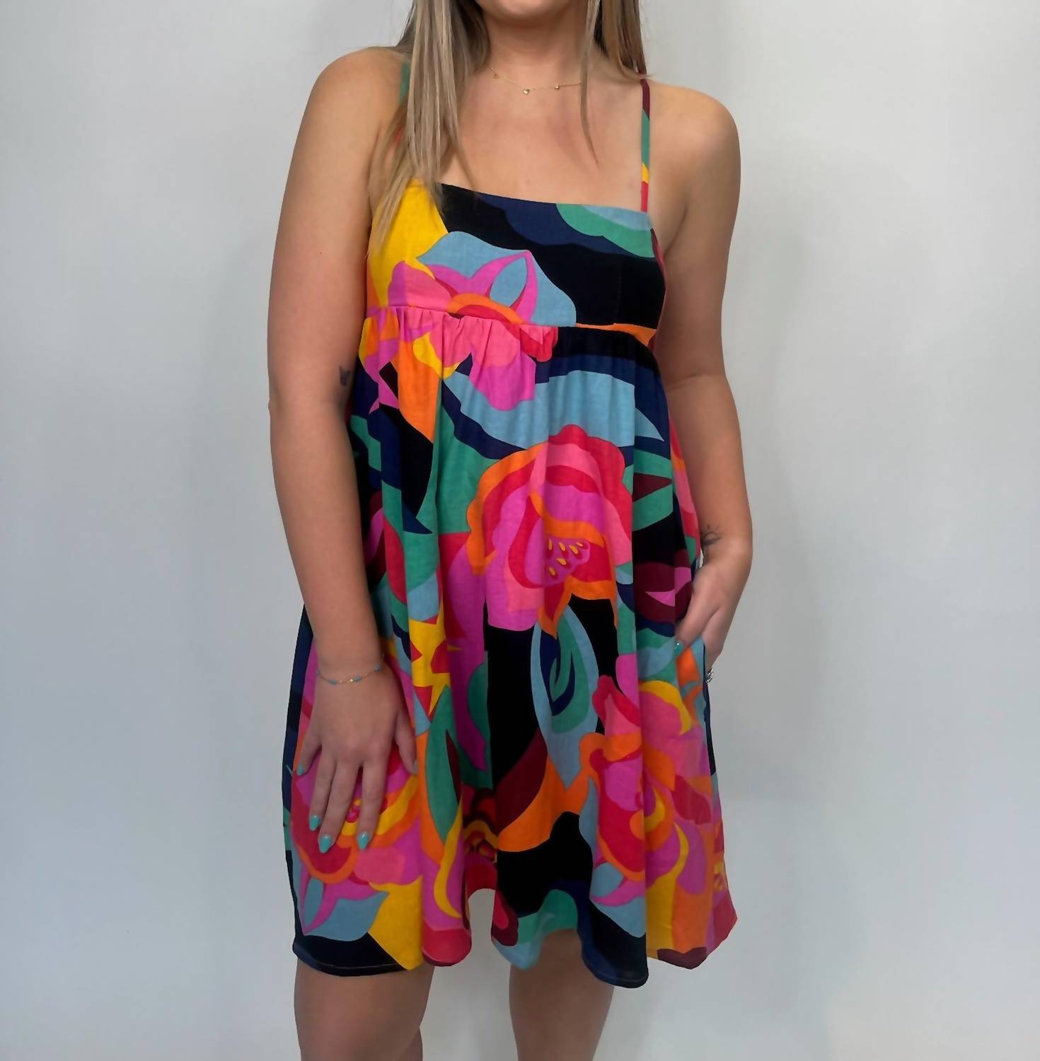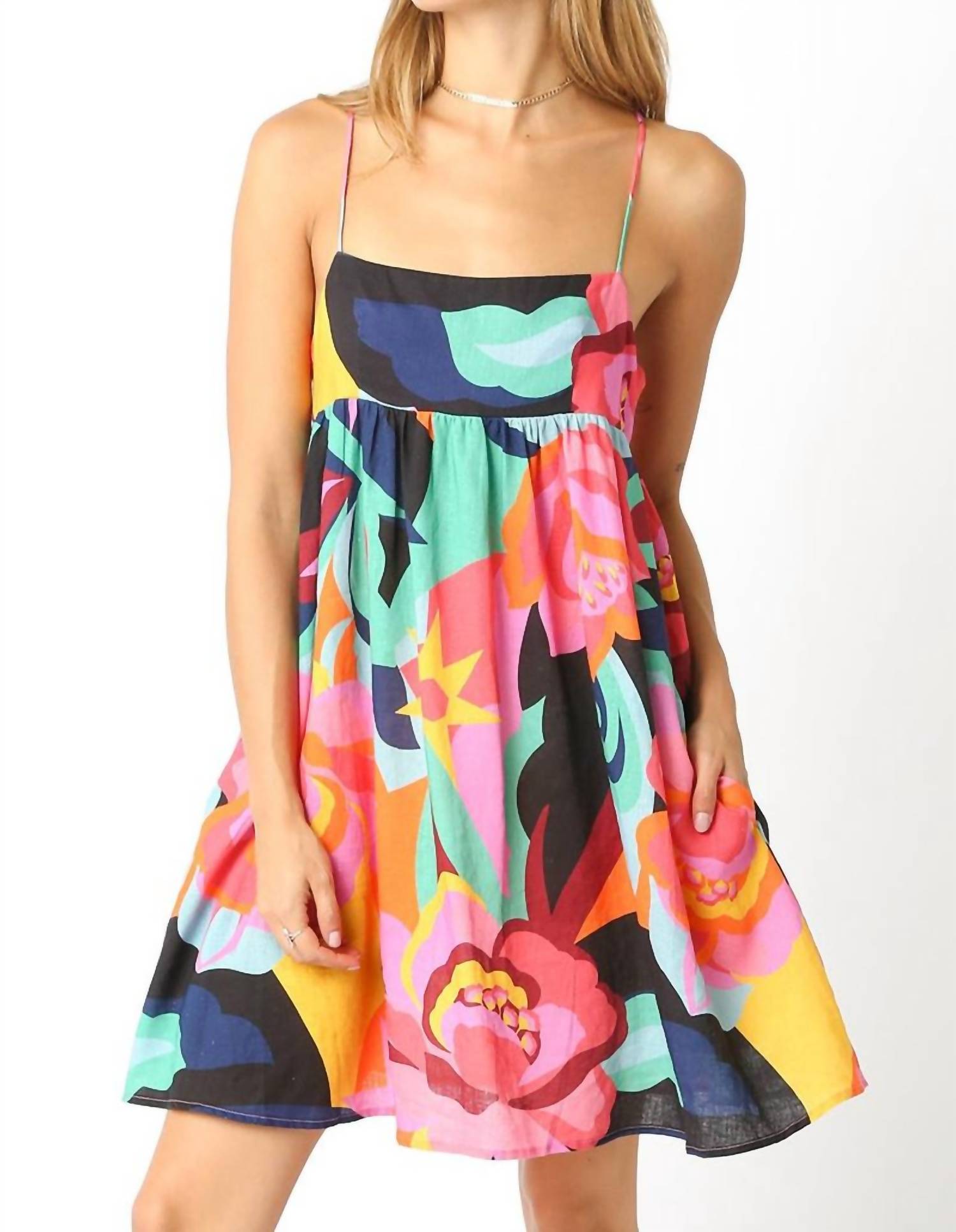 The perfect mini dress for those warmer months. Step into spring with the Floral Mini Dress by Olivaceous, a captivating piece with spaghetti straps and a flattering A-line silhouette. Made from a linen blend of 55% linen and 45% rayon, this dress radiates a bold multi-color floral pattern, perfect for any beach day or Easter celebration. A playful open back complements the zip closure for an extra touch of style, while the squareneck adds a chic edge. Care instructions include hand washing with mild detergent and hang drying to maintain its boho chic appeal.