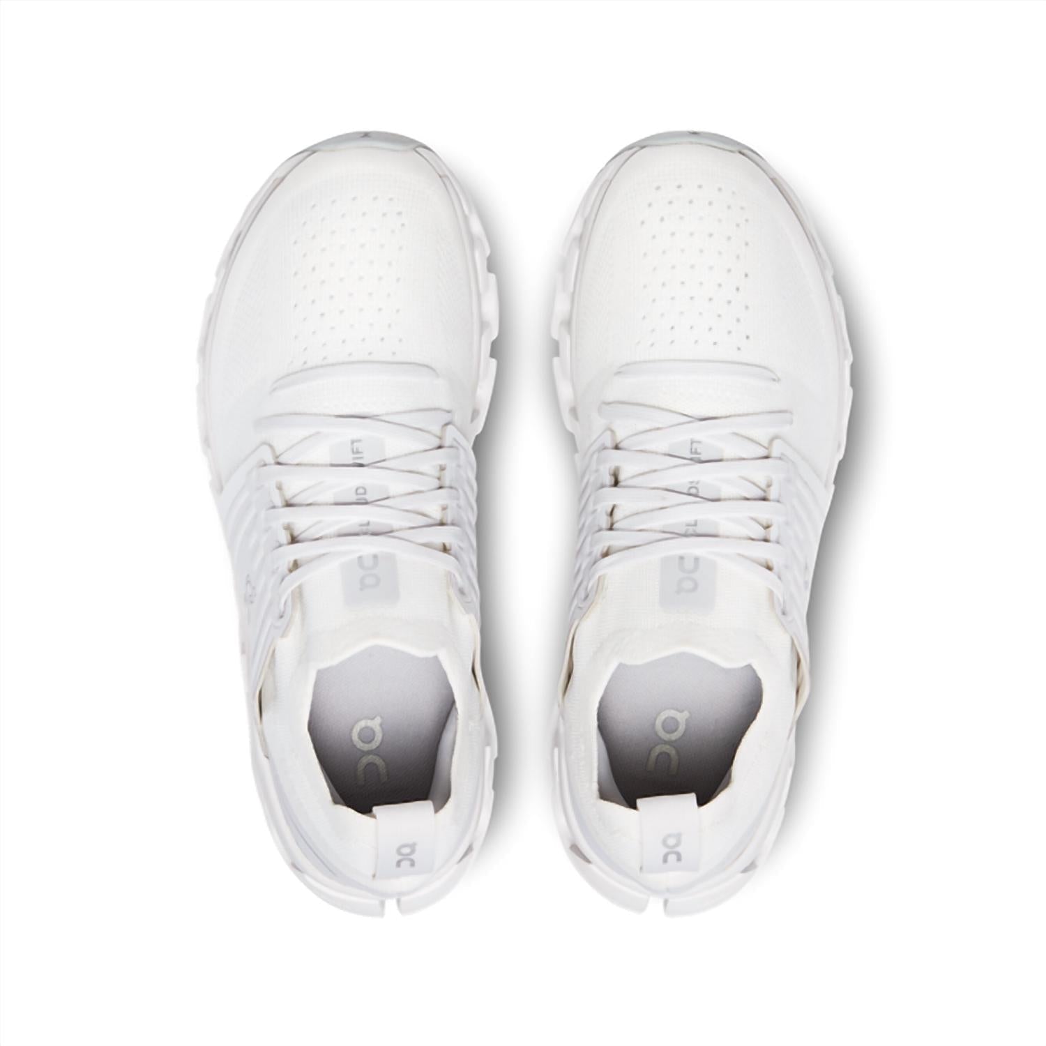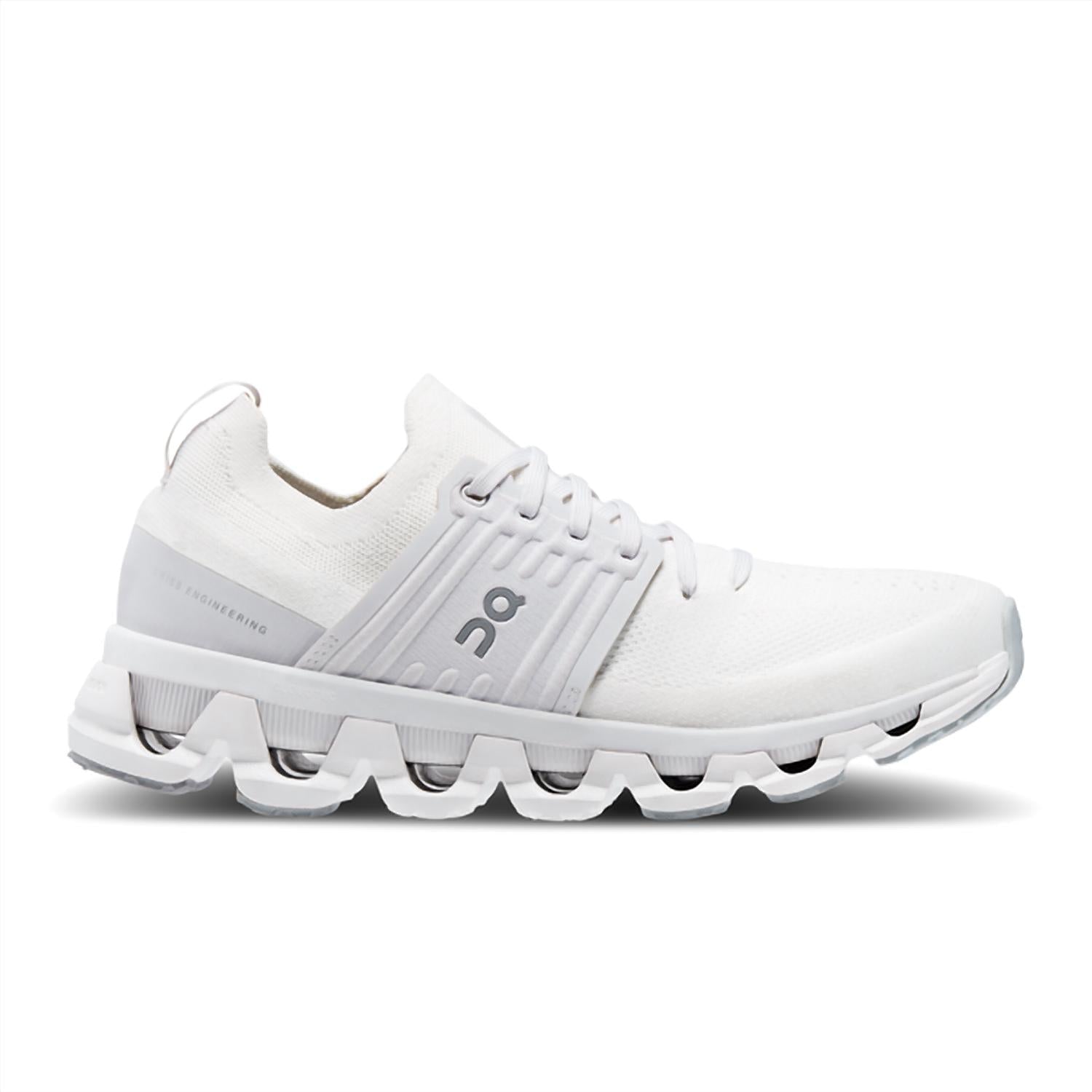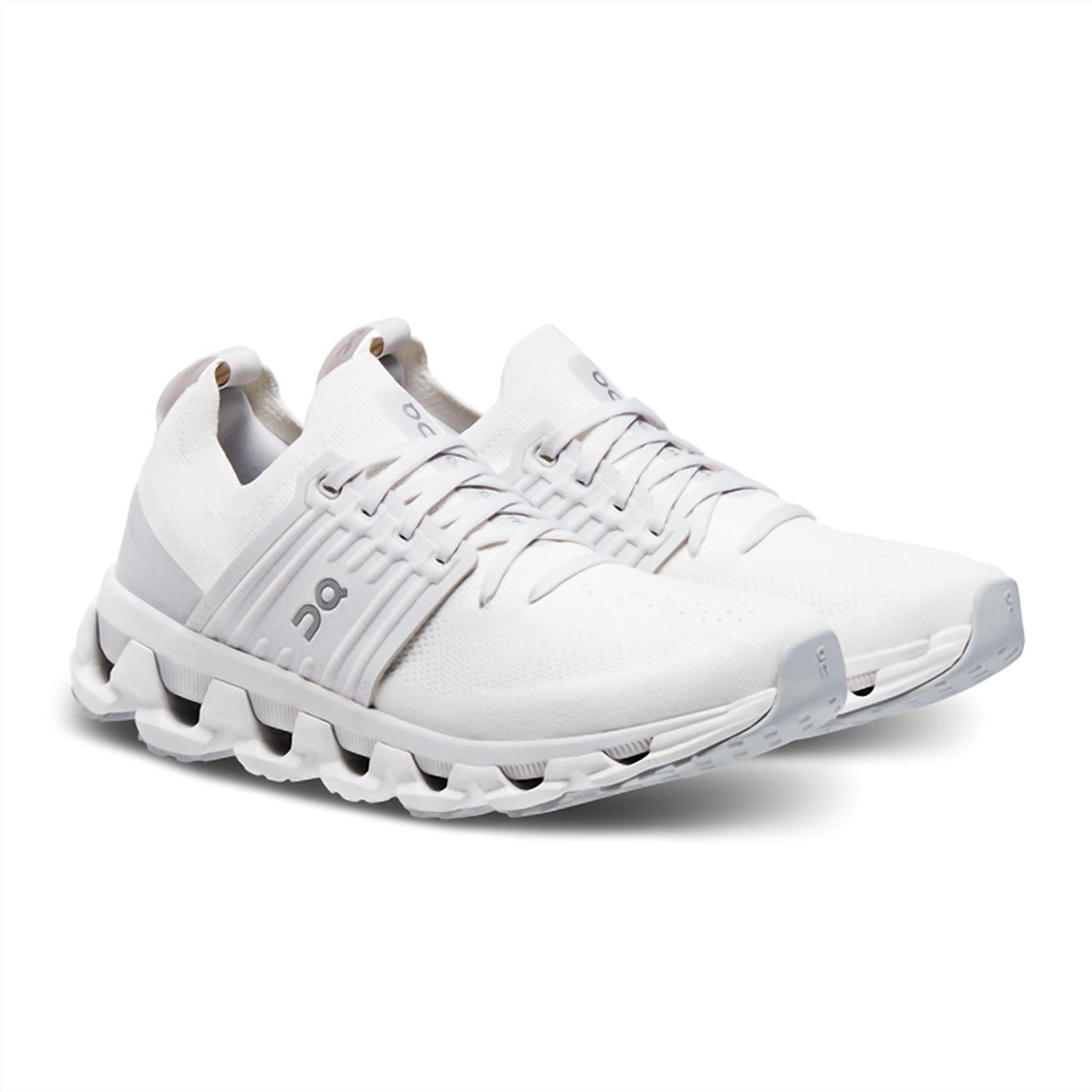 When fashion and function come together seamlessly. Elevate your running experience with the Women's Cloudswift 3 Sneaker by On Cloud, designed in a chic White Frost hue. These sneakers feature a zonal knit upper that ensures an inclusive fit, complemented by a dual-density Helion™ superfoam for optimal cushioning and rolling motion. The improved outsole offers enhanced grip, making it ideal for game day in athleisure style. Effortlessly blend function and trend with this round-toe, flat-heel wonder, crafted for the modern female runner.