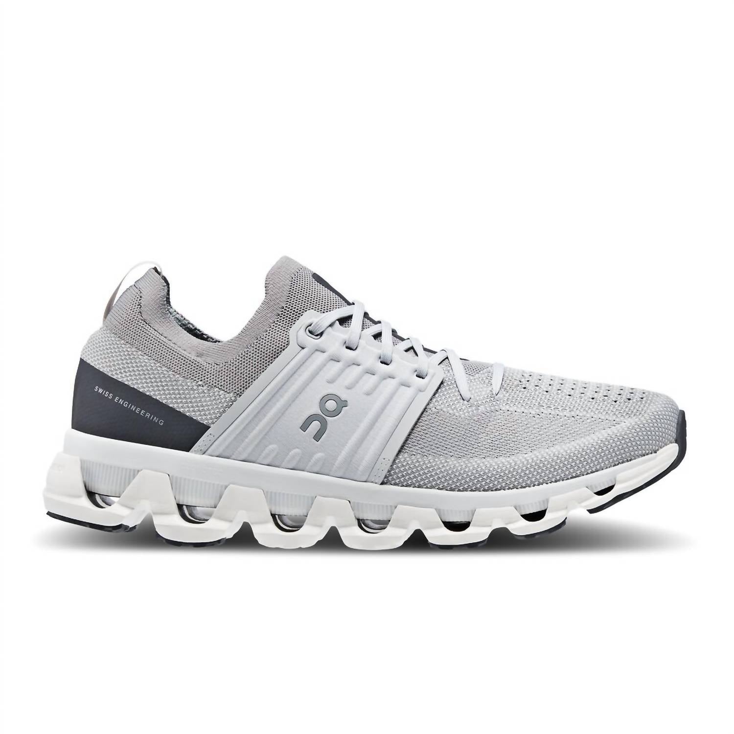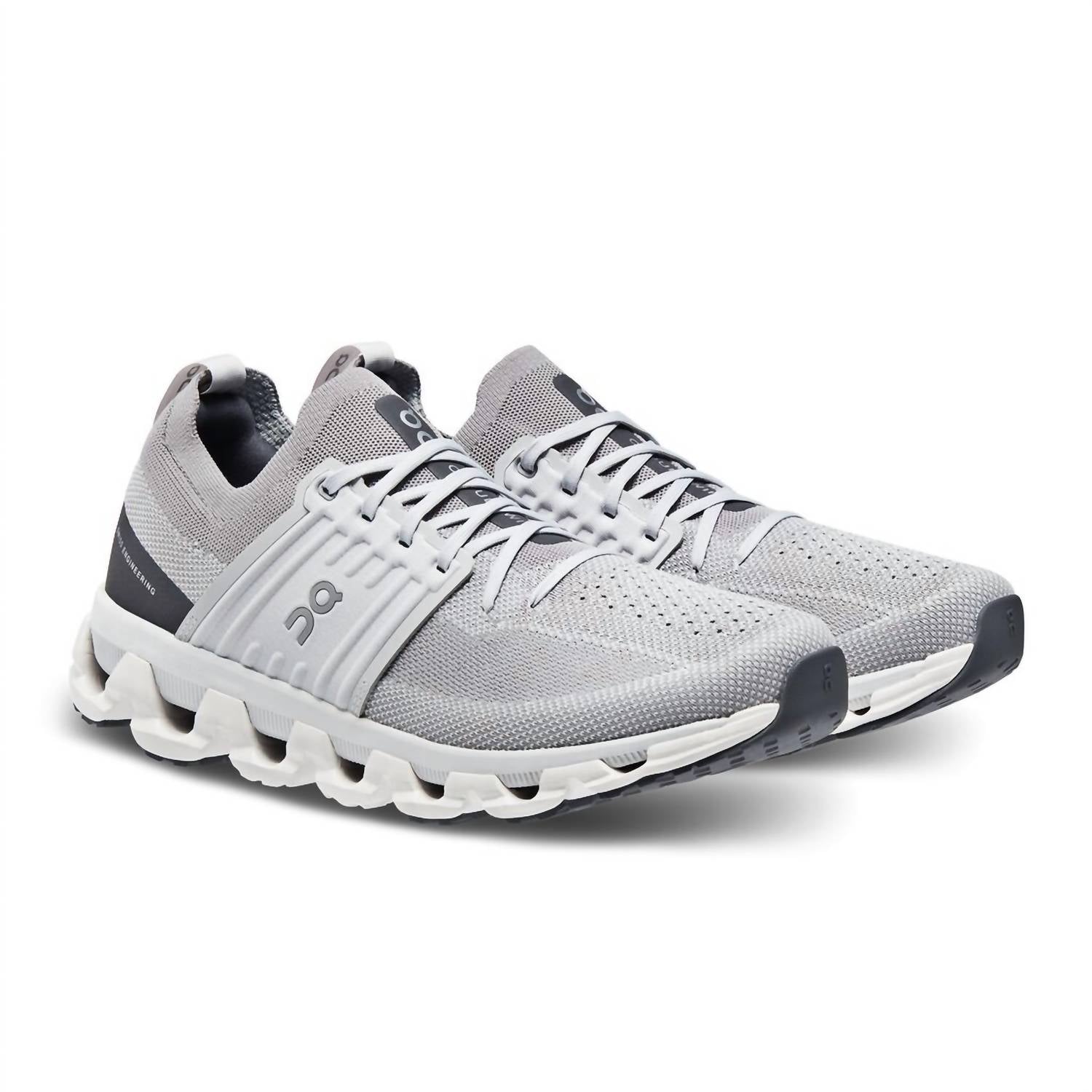 Introducing the Men's Cloudswift 3 Running Shoes by On, crafted for maximum comfort in a stylish ALLOY/GLACIER colorway. Featuring a sock-like upper with 3D heel padding, these shoes provide superior support and an adaptive fit for various foot shapes. The updated CloudTec® midsole, coupled with dual-density Helion™ superfoam, ensures excellent cushioning on hard surfaces. Boasting a 5mm heel-to-toe drop and a round toe shape, these Vietnam-origin sneakers are perfect for spring fitness or workout sessions.