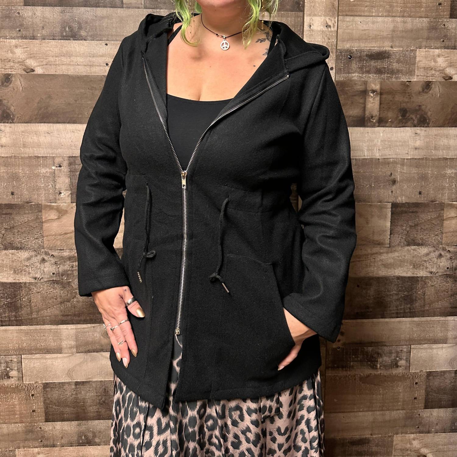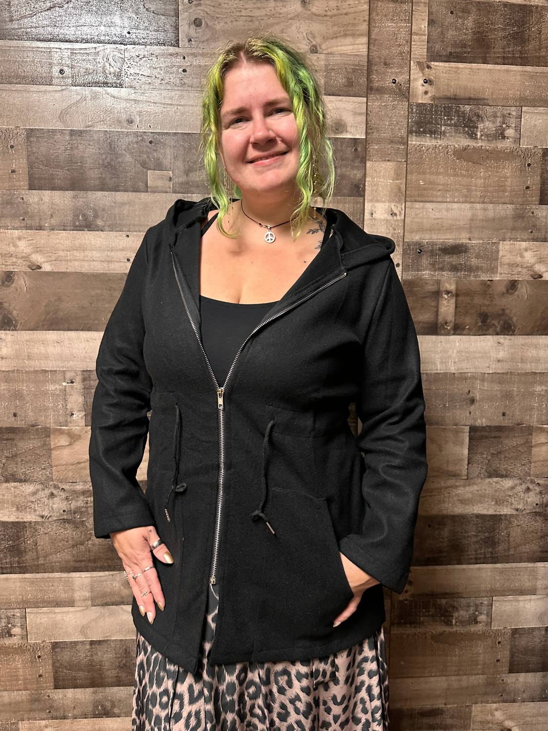 Elevate your streetwear wardrobe with the Women's Alaina Hooded Drawstring Waist Jacket by Ontinva, a sleek utility jacket in solid black. Featuring long sleeves and a hooded neckline, this jacket is ideal for layering during vacation getaways. The practical zip closure adds ease, complemented by an adjustable drawstring waist. Versatile and unlined, it's a stylish choice for transitional seasons.