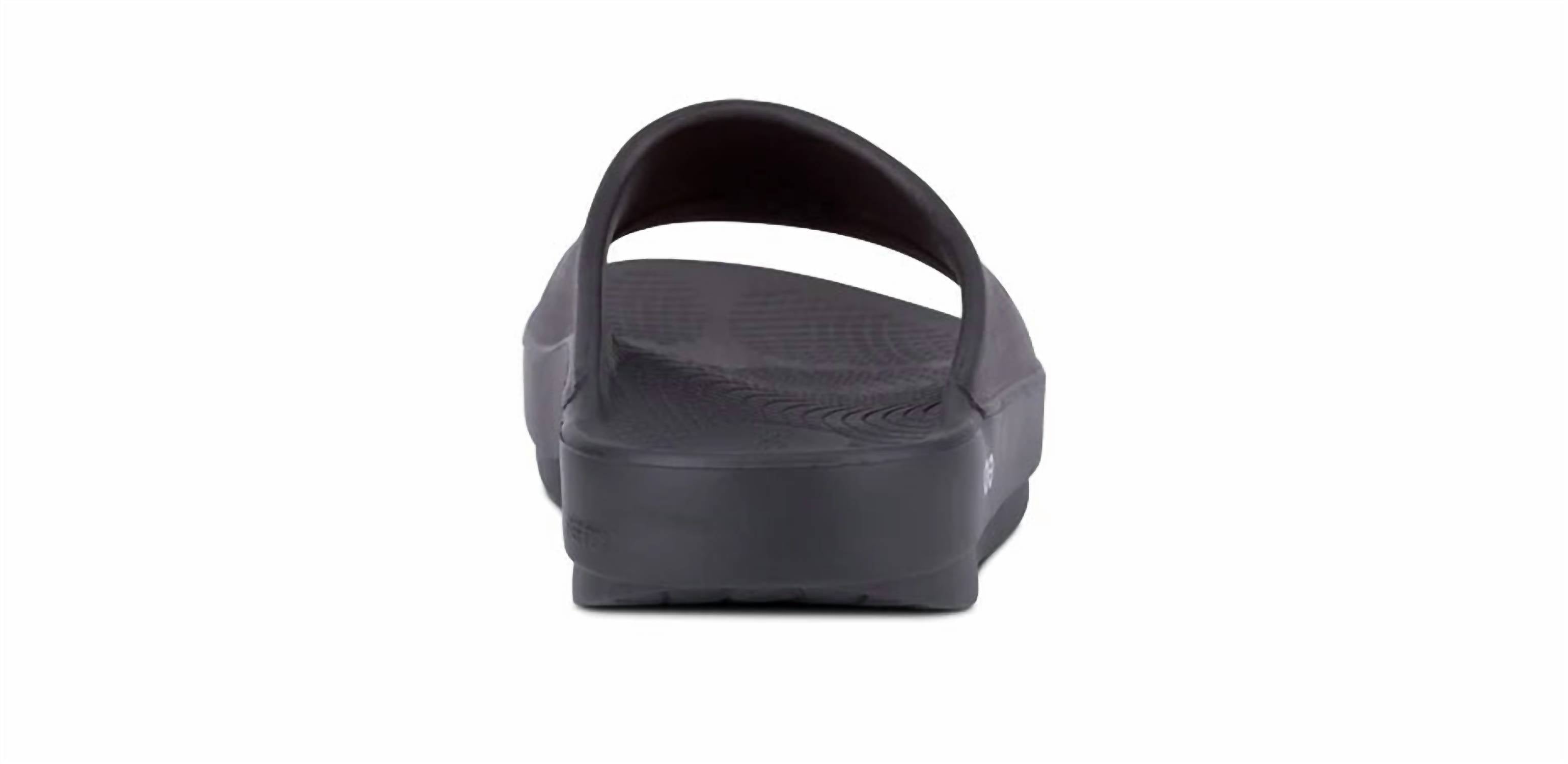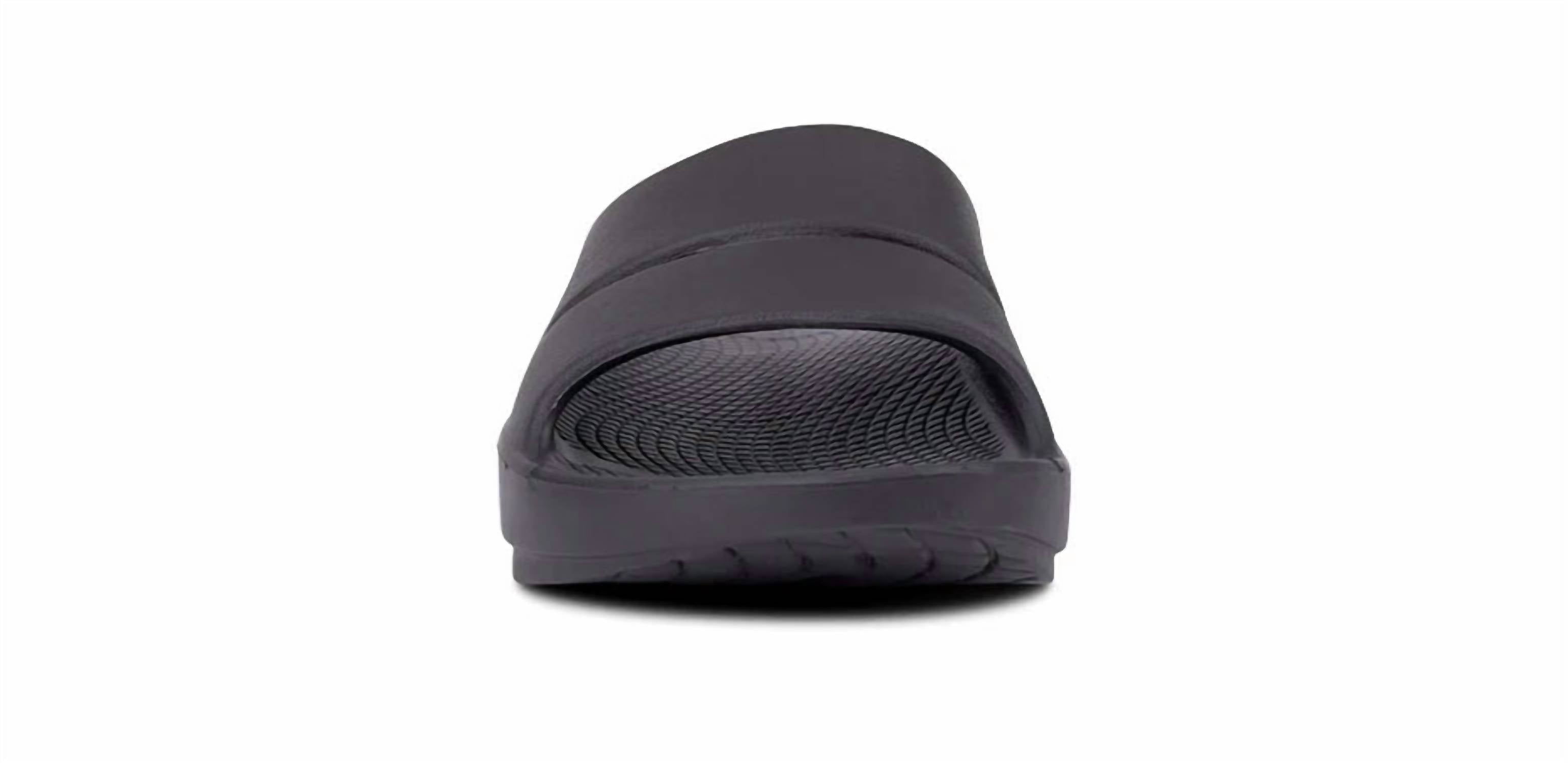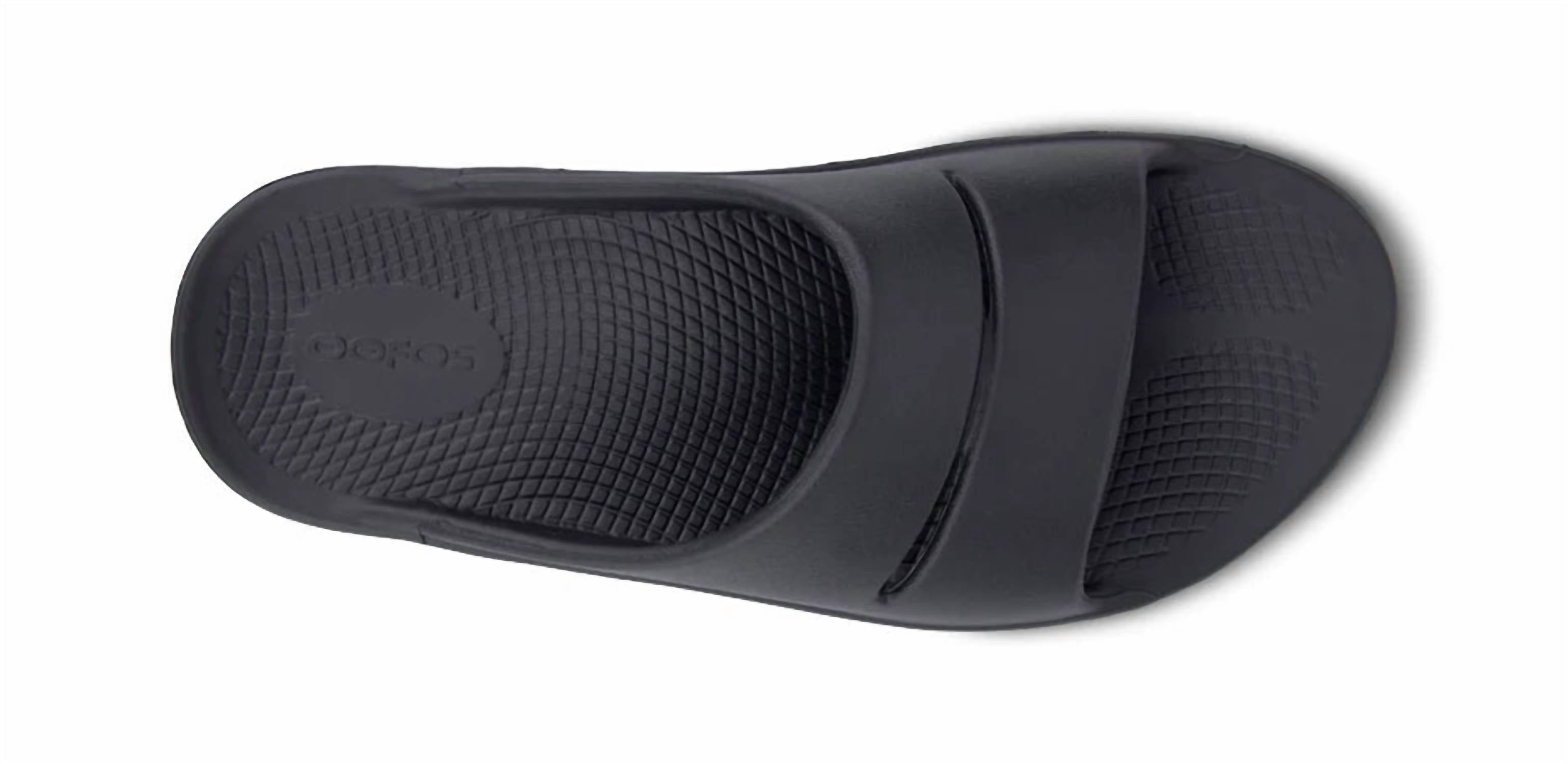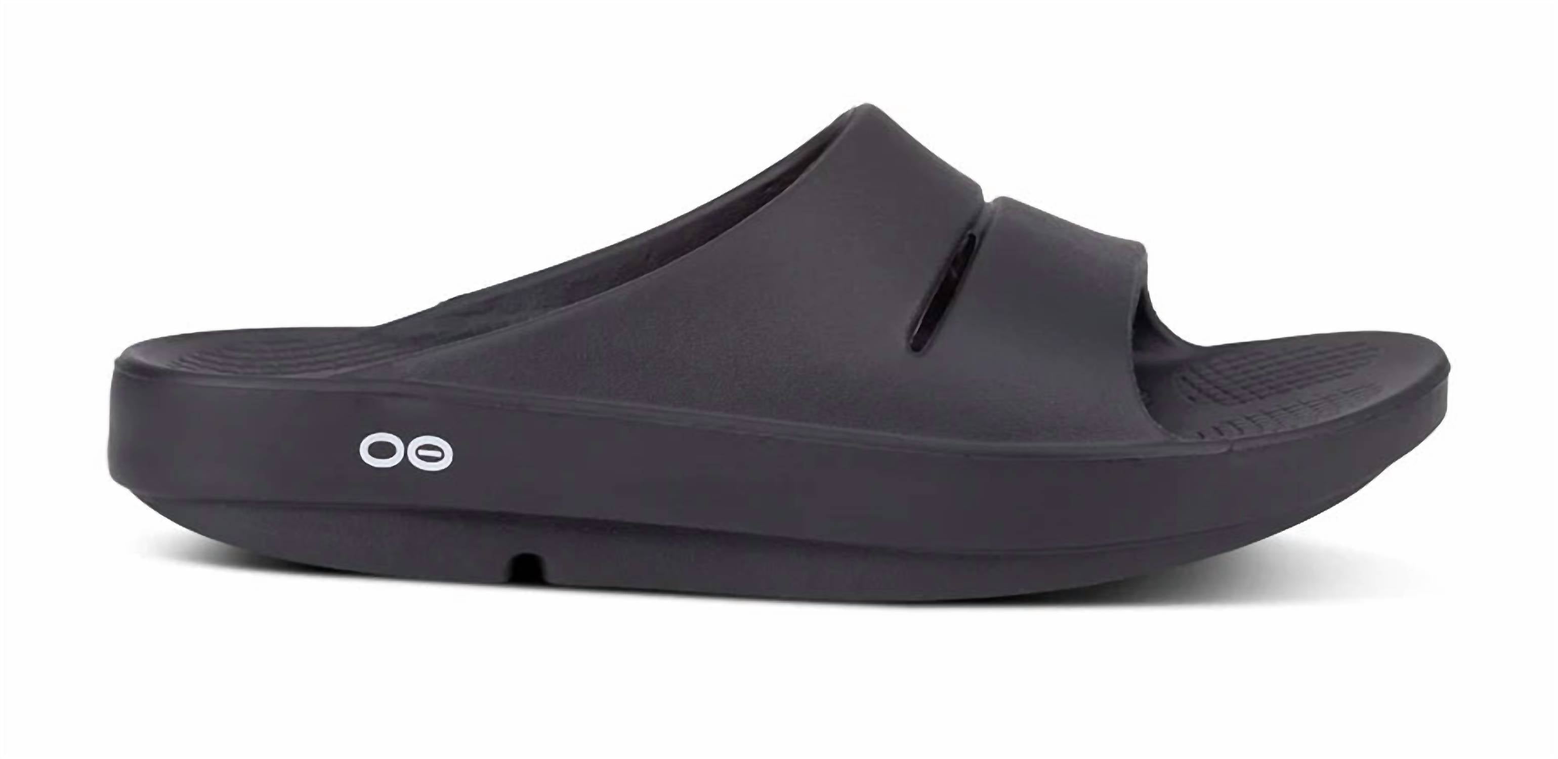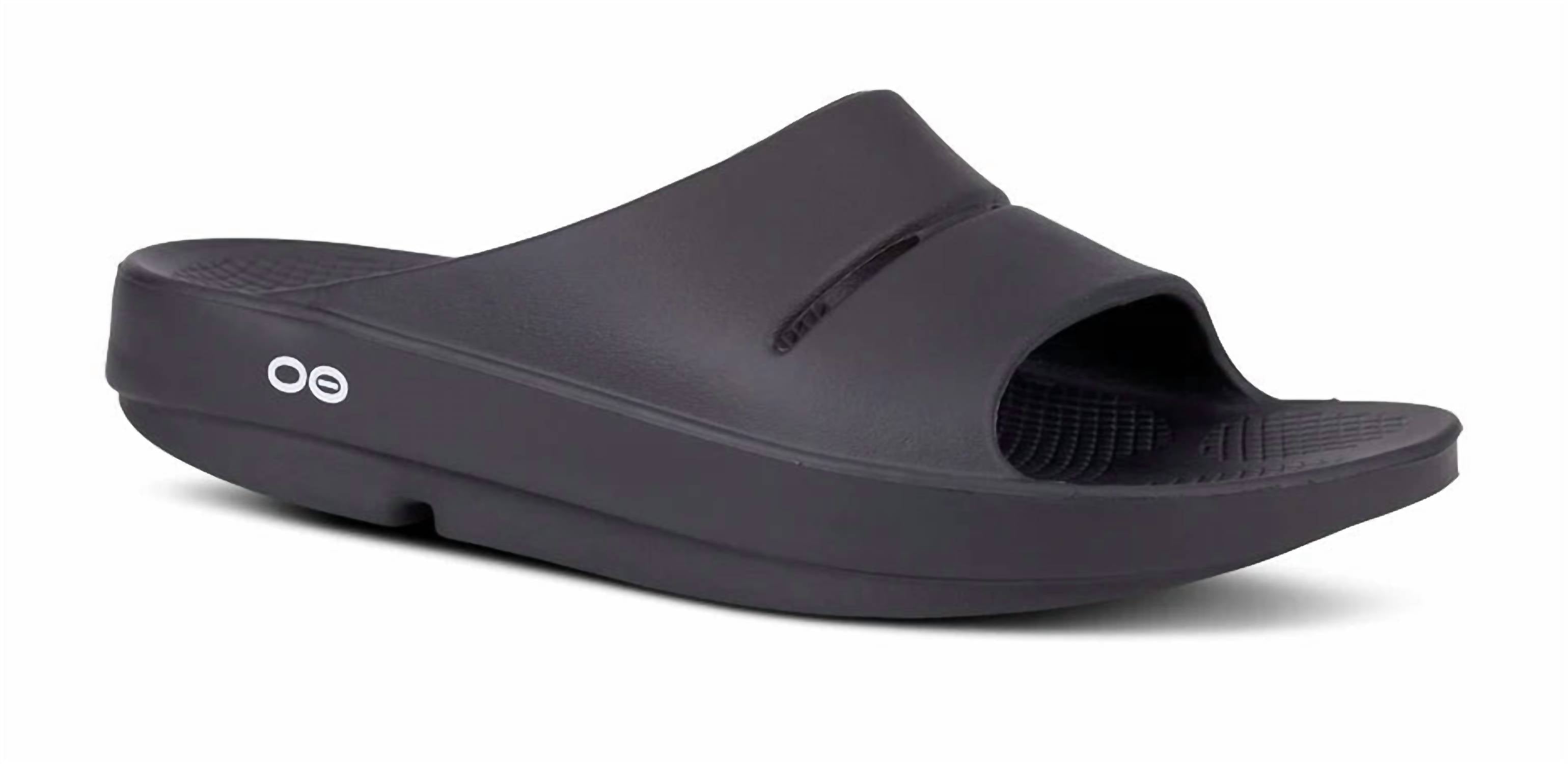 Elevate your summer style with the Men's Ooahh Slide Sandal by OOFOS, perfect for a boho chic vacation vibe. Crafted in timeless black, these sandals feature an agile OOfoam™ strap and open toe design ensuring superior comfort and support. Patented OOfoam™ technology absorbs 37% more impact than traditional footwear, reducing stress on knees, ankles, and other joints. Care is a breeze as the closed-cell foam material is machine washable and minimizes odor, ideal for your active lifestyle.