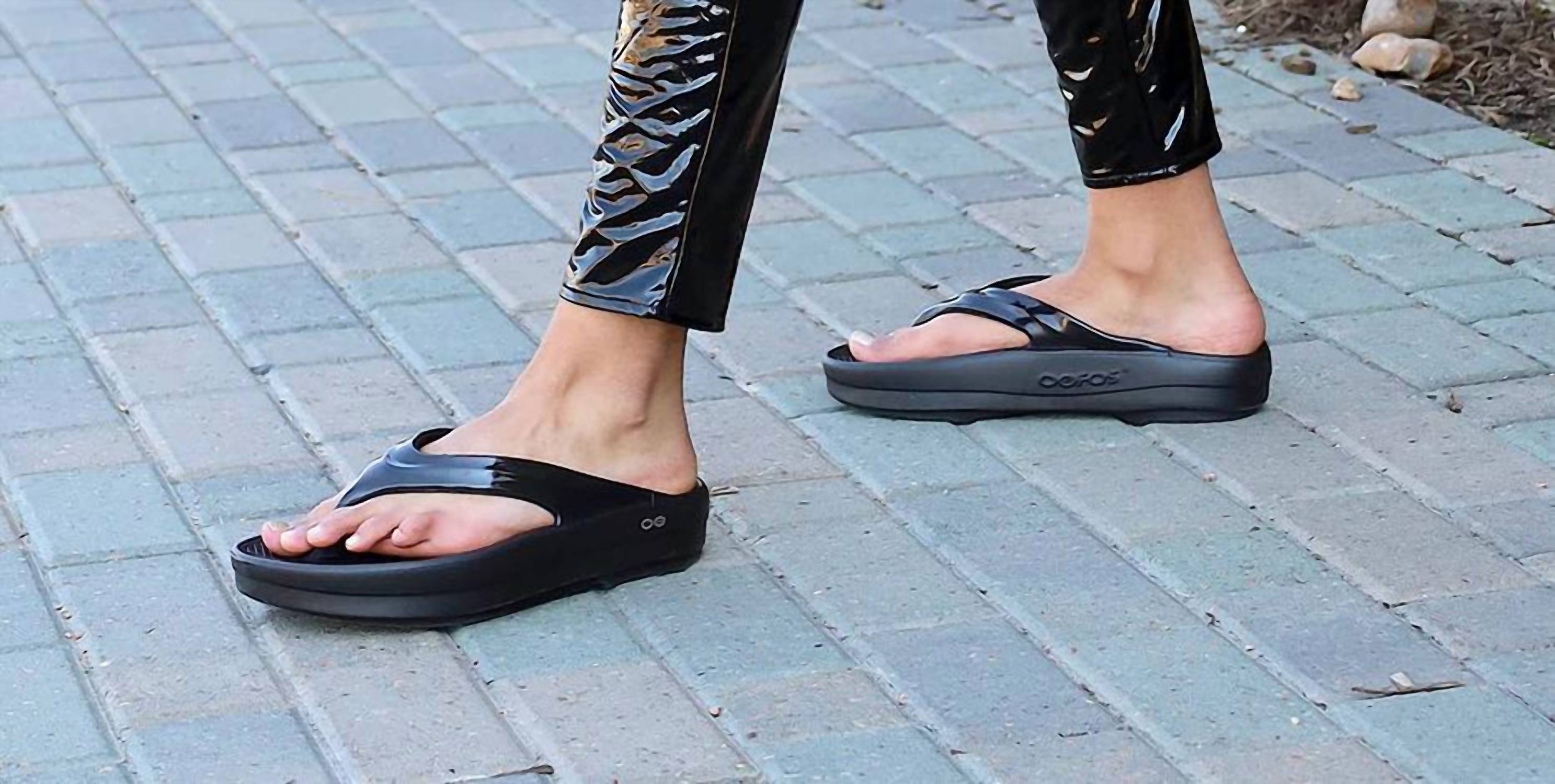 Classicly cute and all-day-wearable. We love this sandal. Step into the future of comfort with the Women's Oomega Thong by OOFOS. These minimalist platform sandals are crafted with OOfoam™ technology and a patented footbed design, offering an extra 15mm of impact absorption for superior active recovery. Perfect for a stylish beach day or a relaxed Mother’s Day outing, these sandals feature an open-toe shape in classic black. Ideal for trend-setting women seeking both comfort and style in the summer sun.