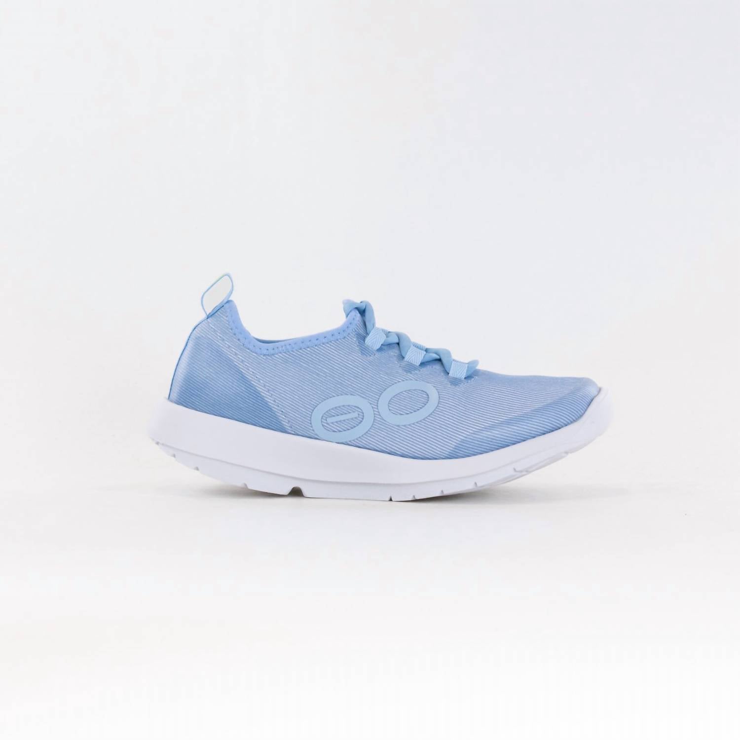 Introducing the Women's OOmg Sport LS Sneaker by OOFOS in a refreshing Carolina Blue, ideal for your athleisure collection. Crafted from rubber with an innovative 4-way stretch FibreFlex upper, this sneaker is designed for active recovery with OOfoam™ technology that absorbs 37% more impact for superior joint protection. The shoe features an integrated lacing system for adjustable heel and midfoot lock, providing lateral stability with a closed-toe silhouette, perfect for game days or any spring activity. The machine washable closed-cell foam ensures odor minimization, making it both practical and stylish.