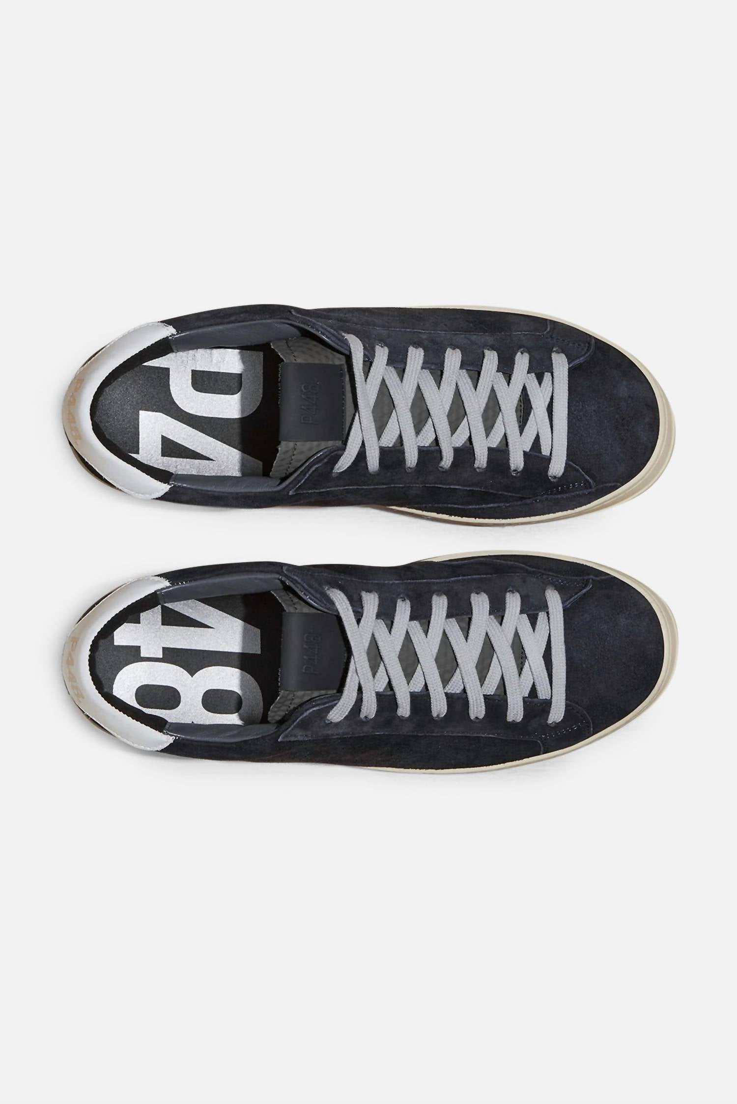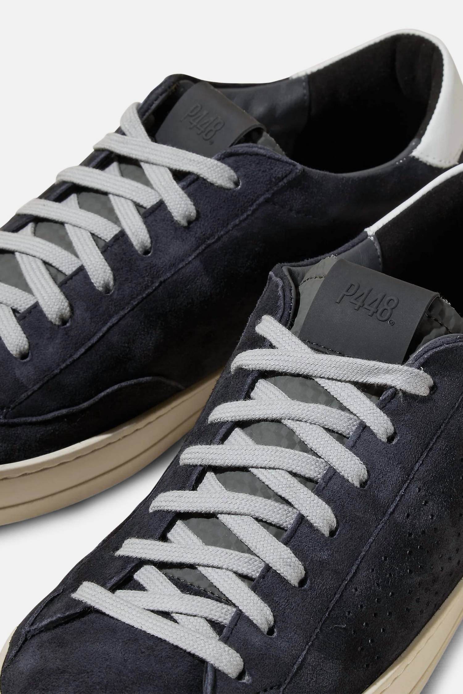 Step into style with the Men's John Sneakers by P448, featuring a distinctive navy suede upper with a perforated P448 logo. Detailed with a dark grey cubic-print tongue, navy suede trim, and a white calf leather heel tab, these sneakers blend effortlessly from work to weekends. Made in Italy, they include a terry cloth lining and memory foam insole for comfort, while a hand-distressed rubber sole and black tread ensure durability. Elevate your summer streetwear look with these round-toe sneakers, perfect for travel and gifting this Father's Day.