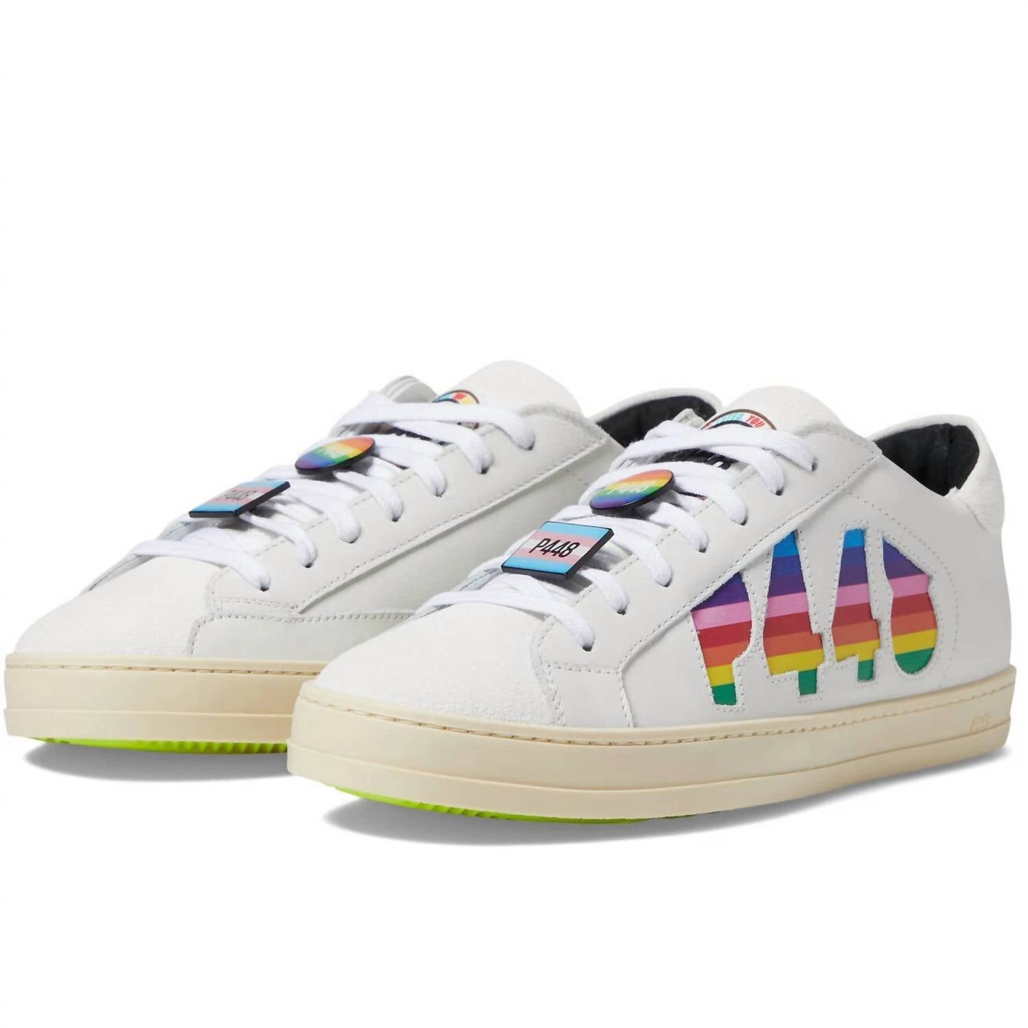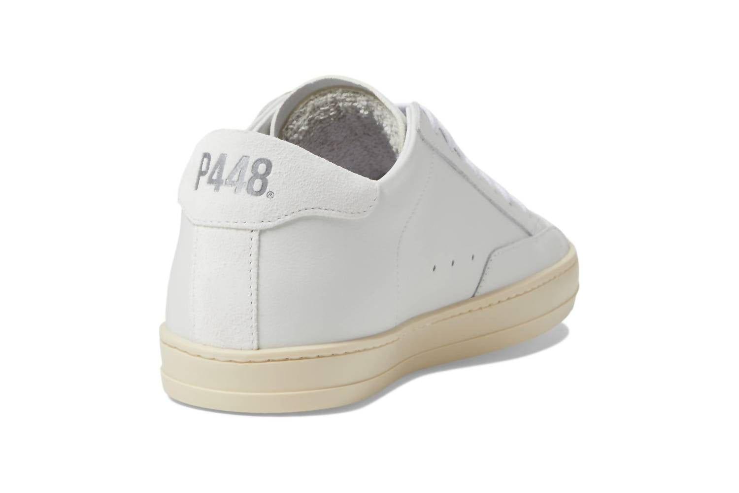 Get your daily steps in with these adorable sneakers. Elevate your footwear collection with the P448 Women's John Trainers Sneakers in Pride White, combining style and comfort seamlessly. Crafted from premium leather, these low-top sneakers feature a perforated rainbow P448 logo, a terry cloth lining, and a suede heel tab for added flair and comfort. Made in Italy, they have a lace-up closure and a synthetic outsole with white cotton laces for a snug fit. Care for these stylish sneakers with ease while enjoying their all-day comfort, enhanced by a cushy memory foam insole. With a round toe design and flat heel under 1", they weigh 14 oz in a size EU 39 (US Women's 9).