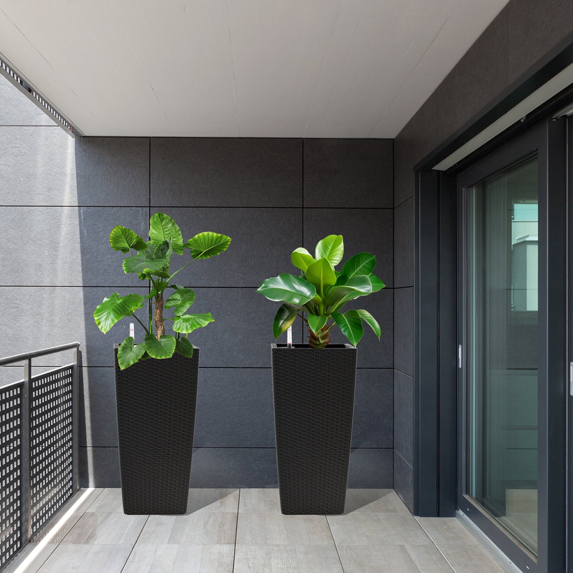 This set of two square planters is designed to enhance outdoor spaces such as gardens, porches, patios, or backyards. They combine a rustic faux rattan appearance with a practical automatic watering system for stylish and convenient plant care.