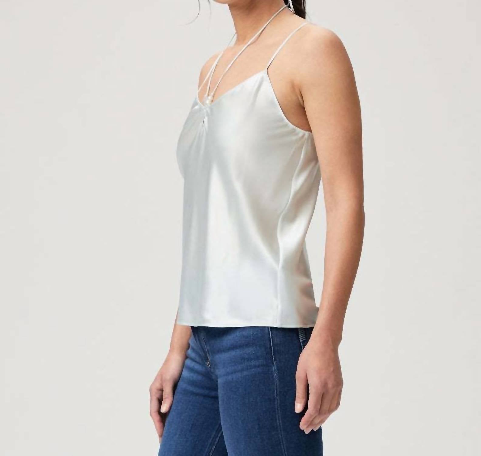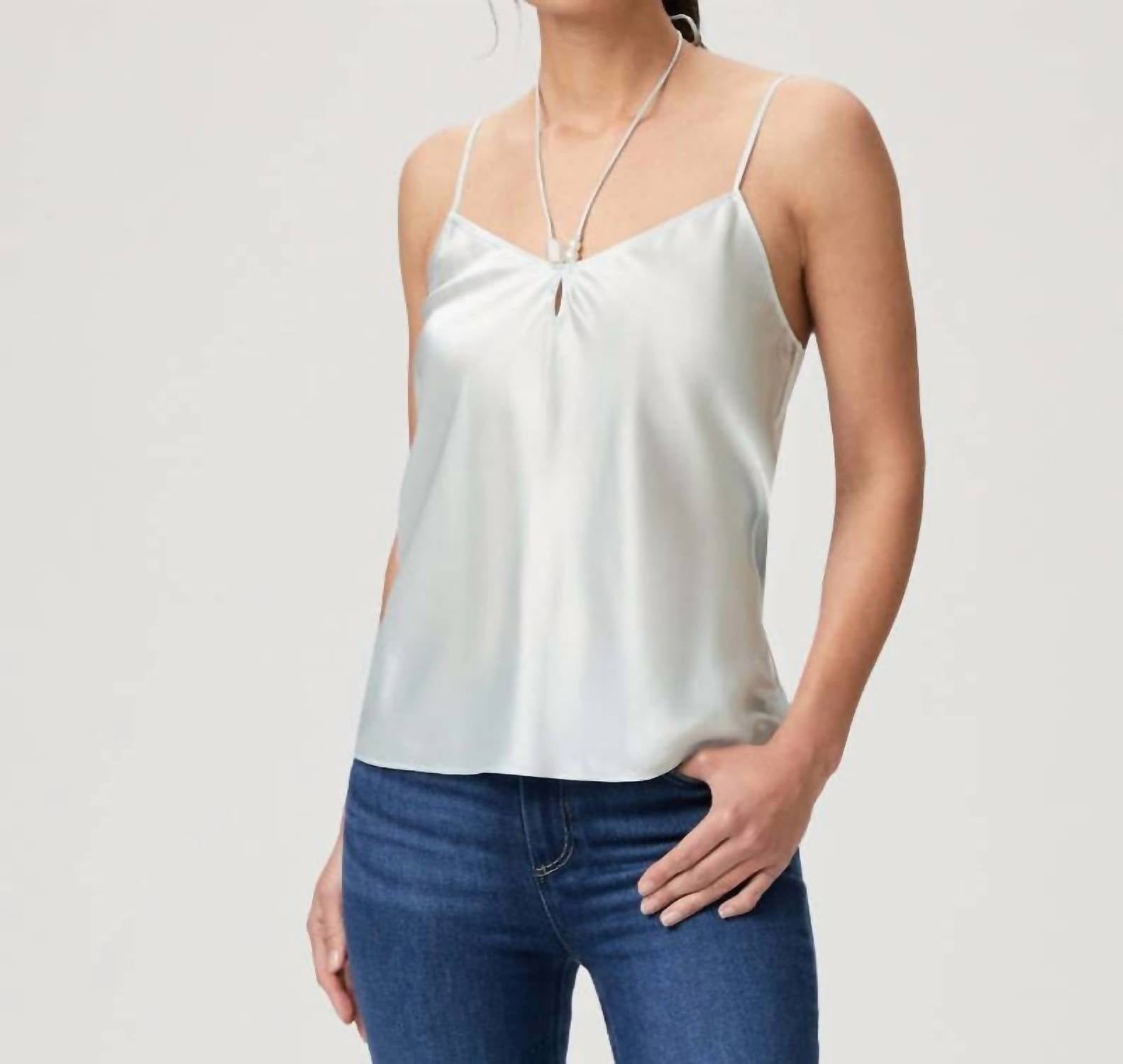 Throw this on with your favorite blazer for a more polished look. Experience the epitome of luxury with the Arina Cami by Paige, crafted from 100% silk satin in a chic Ice Flow hue. This imported garment features delicate spaghetti straps and an enchanting shell-inspired beaded halter neck for added elegance. Its flattering, relaxed fit with a smooth drape makes it perfect for tucking into trousers or pairing with jeans. Closure: Pull on.