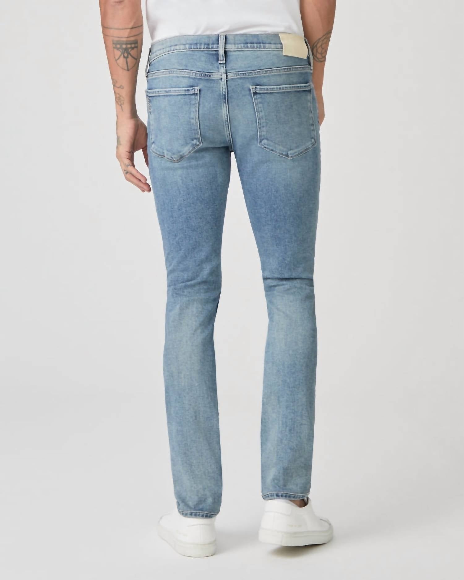 Crafted meticulously for the modern man who values both style and comfort. Featuring a perfect light wash with natural fading and whiskering. Embody a sleek, contemporary vibe. Lennox is Paige’s signature slim fit. Artfully designed to be fitted through the thigh and taper elegantly from the knee to the leg opening, ensuring a flattering silhouette. Made from the renowned TRANSCEND denim. Guarantees unparalleled comfort with its premium stretch and outstanding recovery. Low-rise cut, combined with a convenient button closure and practical pockets. Promises a versatile and functional addition to your wardrobe. Perfect blend of fashion and functionality with the Lennox Slim Fit Jeans. Impeccably designed for the discerning gentleman.