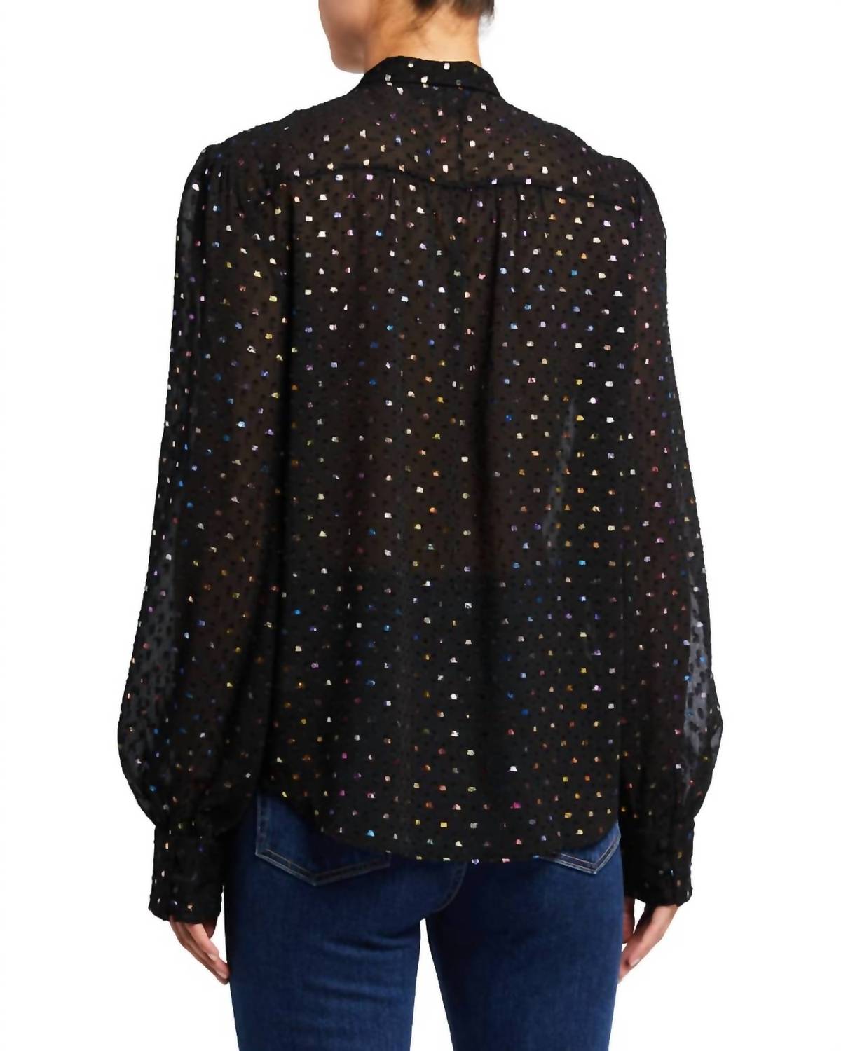 A timeless blouse that will never go out of style. This blouse features a stylish V-neck design with ties and long sleeves, perfect for adding a touch of elegance to your wardrobe. The pullover style ensures easy wear, while the metallic detailing adds a subtle shimmer for a refined look. Made from 100% polyester, this blouse combines comfort with a chic aesthetic. It fits true to size and is recommended to be hand washed or dry cleaned for maintenance. The approximate length from the high point shoulder to hem is 26.5 inches, based on a size small.