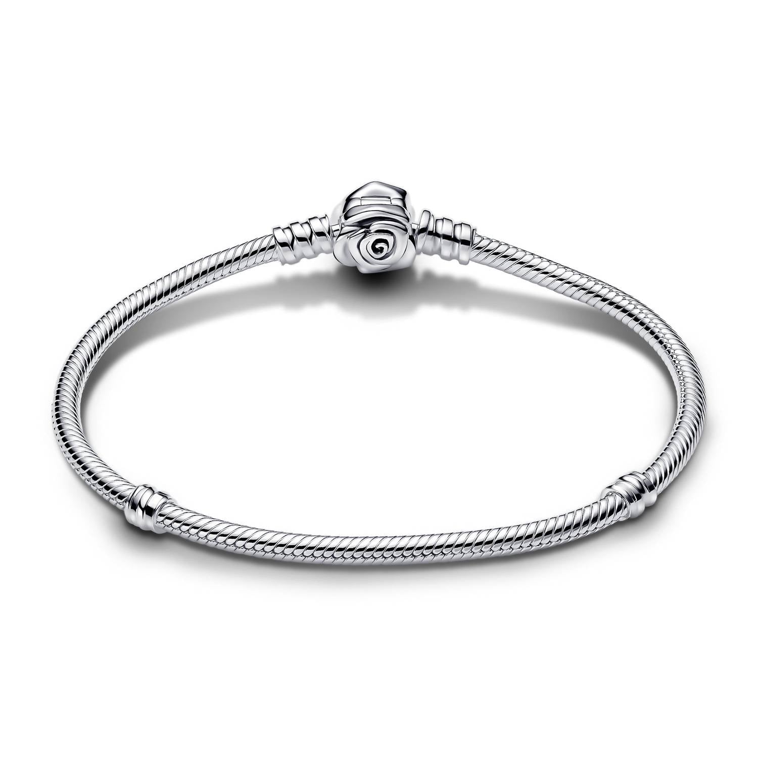 Discover the Pandora Women's Snake Chain Rose Clasp Bracelet, a testament to romantic elegance. Made with silver plating, this bracelet features a beautifully intricate rose clasp symbolizing love. Accommodating 16-18 charms, it's a customizable accessory with functional threaders for personalized spacing. Enhance your look or gift it to someone special, celebrating the bond of love and affection.