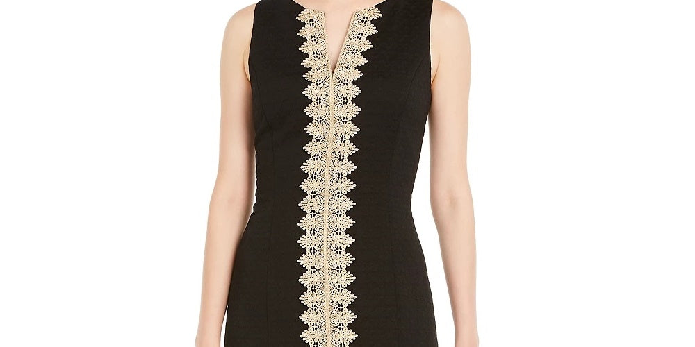 Approx. 35-3/8" long from center back neck to hem. Length is based on size 8 and varies 1/4" between sizes|V-neckline; Sheath silhouette|Hidden back zipper with hook-and-eye closure|Metallic embroidery at center front|Lined