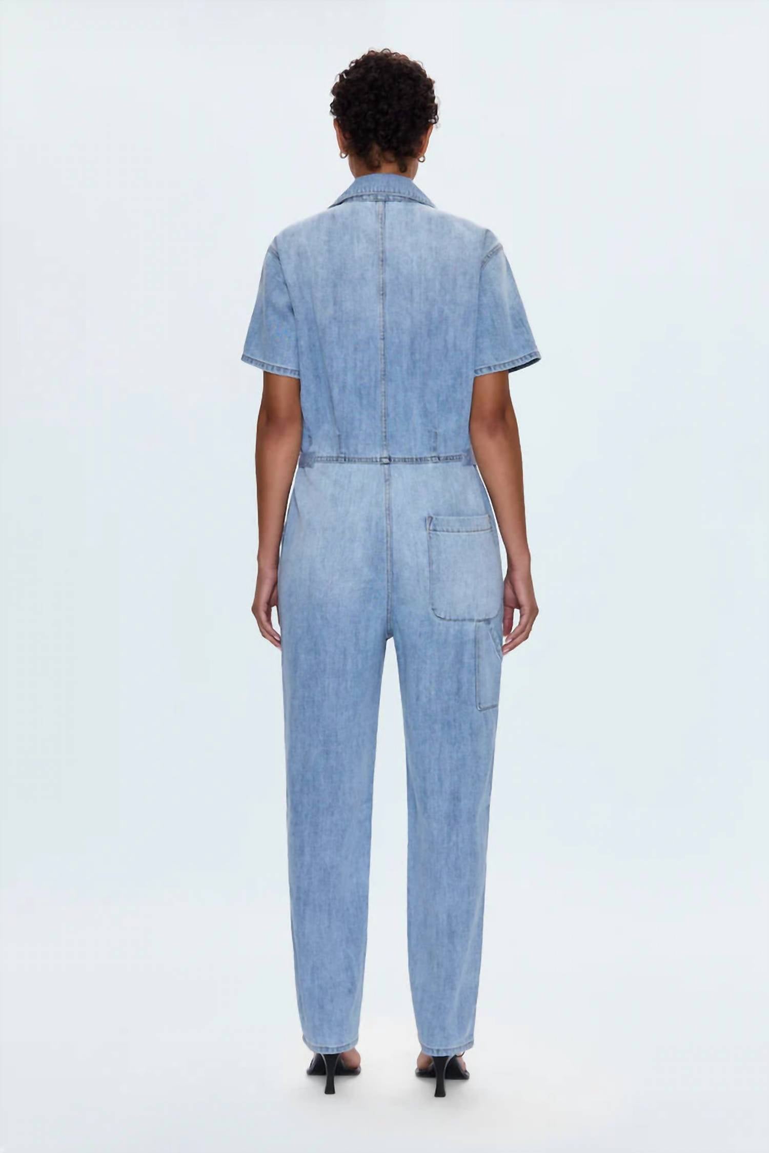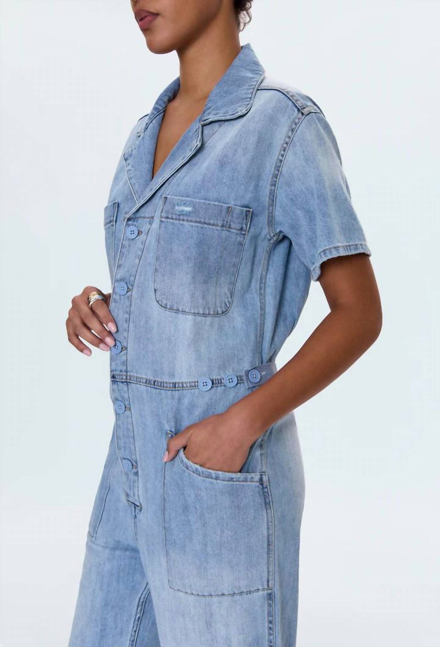 It doesn't take much for this one piece to look effortlessly cool. Add some statement jewelry to dress it up, or throw on some sneakers for a more casual vibe. Introducing the Pistola Grover Short Sleeve Field Jumpsuit in the color Disoriented, a chic streetwear piece perfect for vacations. Made from 100% cotton, this jumpsuit features a relaxed fit with a button closure for easy wear. The light wash denim and adjustable waist offer both style and versatility. Care: Machine wash cold, tumble dry. A wardrobe essential for the fashion-forward woman.