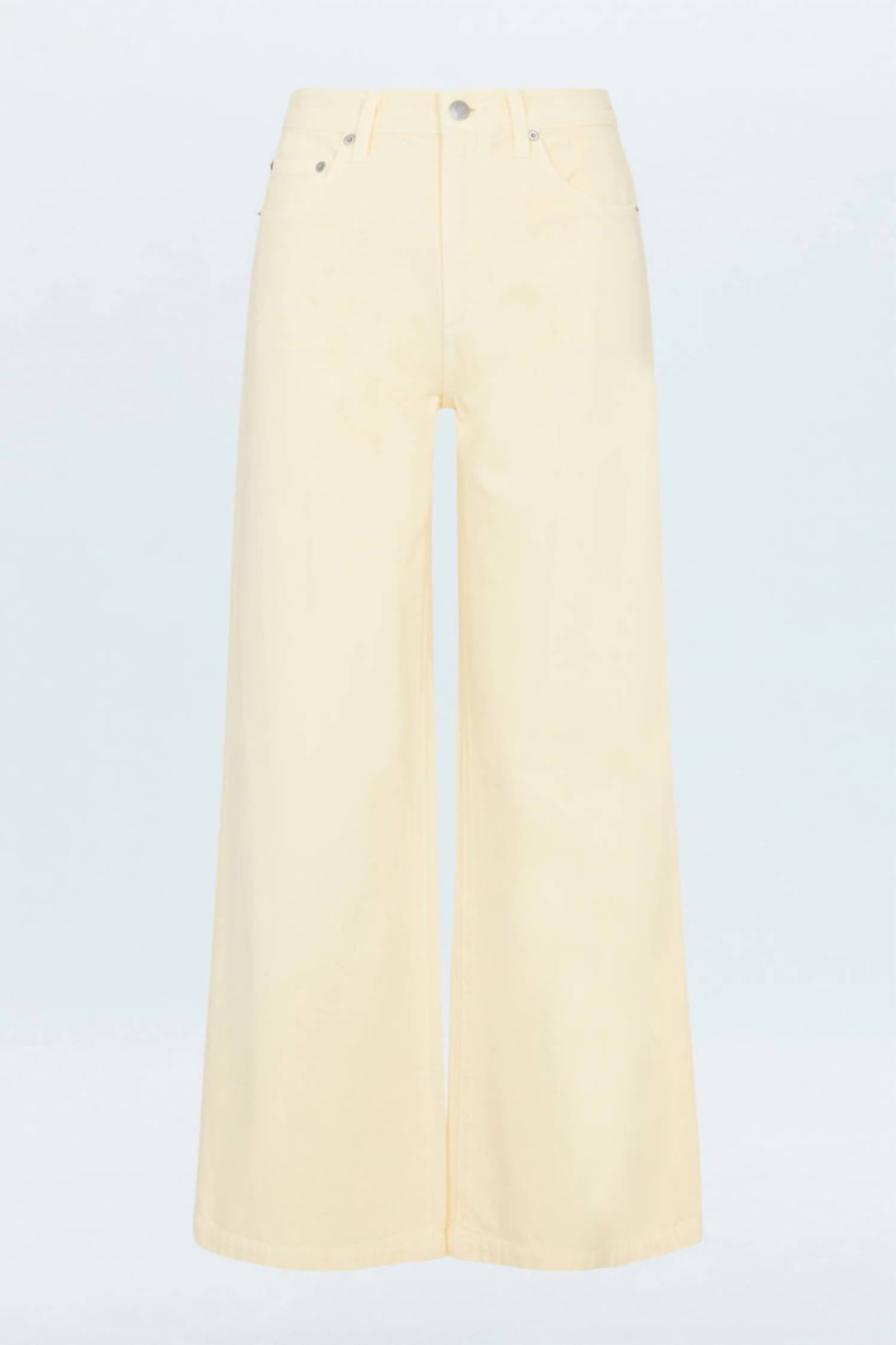 Introducing the Jadyn Low Slung Palazzo Wide Leg Pants by PISTOLA, a chic addition to your summer wardrobe in a refreshing Lemonade hue. Crafted from a soft cotton blend with 62% Cotton and 38% Lyocell, these pants feature a high-rise and relaxed fit, culminating in a wide leg style with a leg opening of 25 inches and an inseam of 32 inches. Designed with a button closure, they offer functional pockets for added convenience. Embrace the 90s fashion trend and stay on point whether you're casually strolling or on vacation. Care: Machine wash.