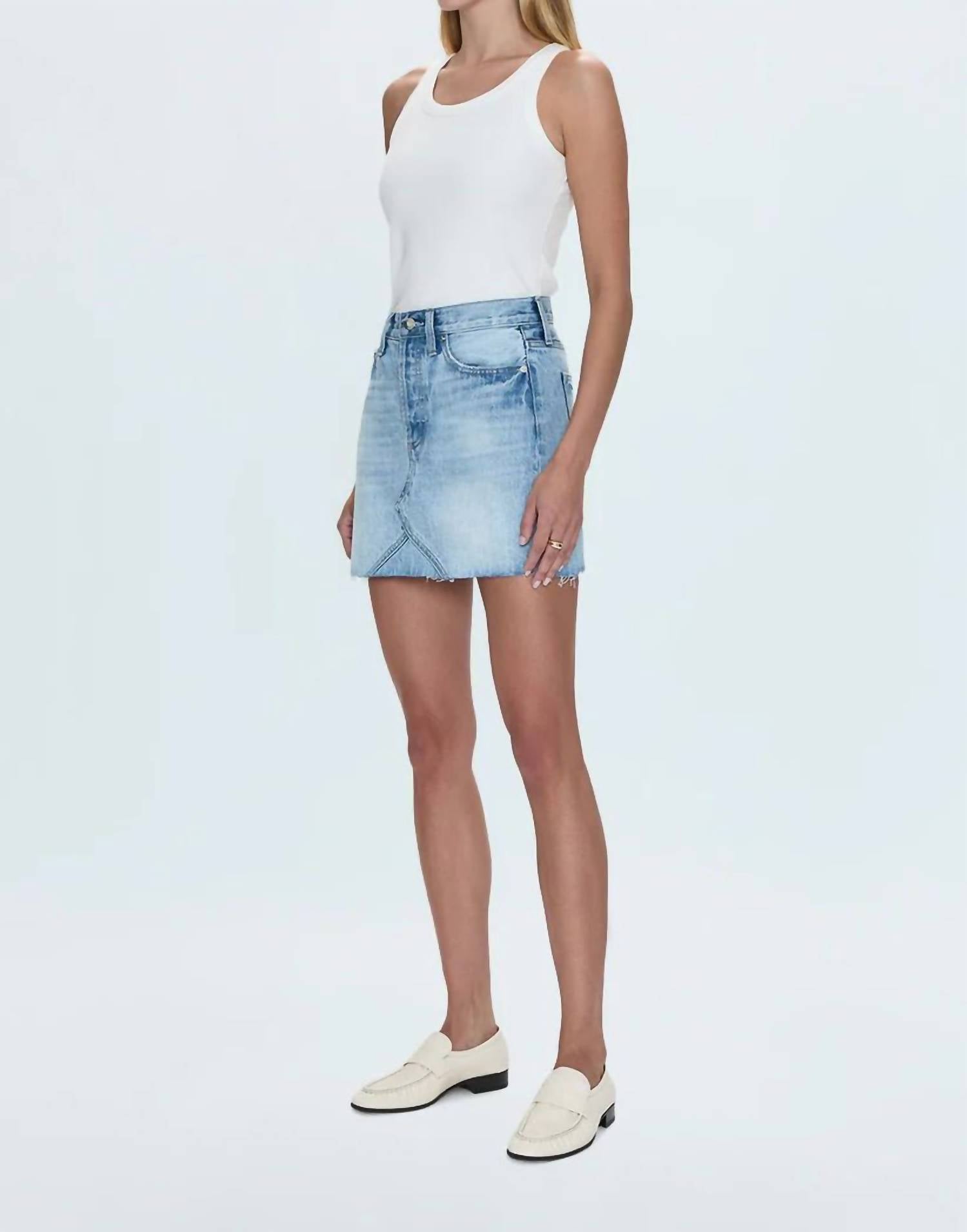 The perfect mini skirt does exist. Introducing the Kat High Rise Skirt by PISTOLA, a chic addition to any wardrobe in the Academia color. Crafted from 100% Cotton, this mini skirt features a modern 15" length and a flattering high-rise fit. With a 5-pocket design and textured pattern, it's both practical and stylish, finished with a raw hem for that touch of modern cool. Closure: Button closure. Perfect for streetwear or a holiday party, this versatile skirt is sure to elevate your summer style.